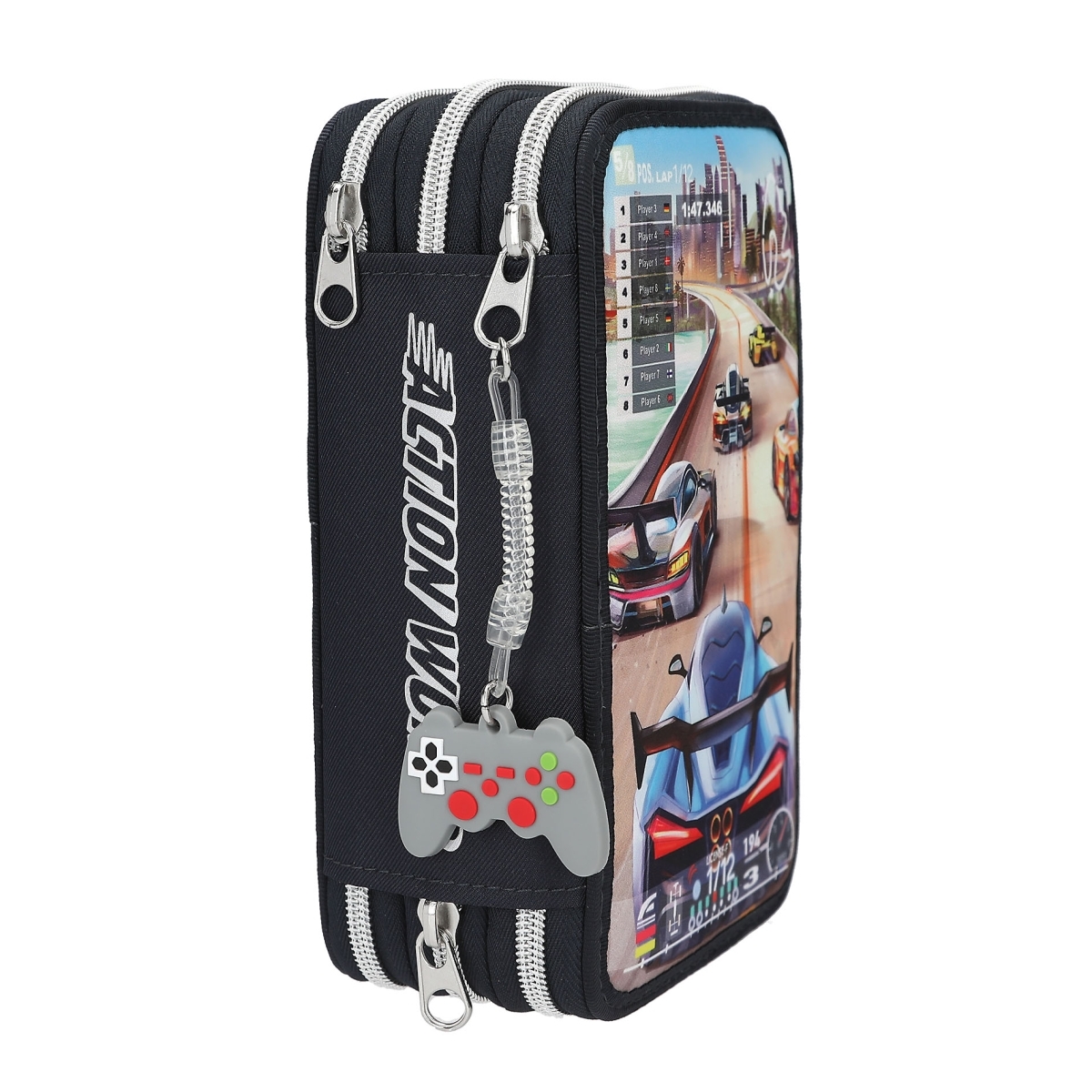 Praktisk og smart penalhus fra Action World i mørkeblå og med et sejt motiv på forsiden fra en cool scene fra et car racing game med en city skyline i baggrunden.