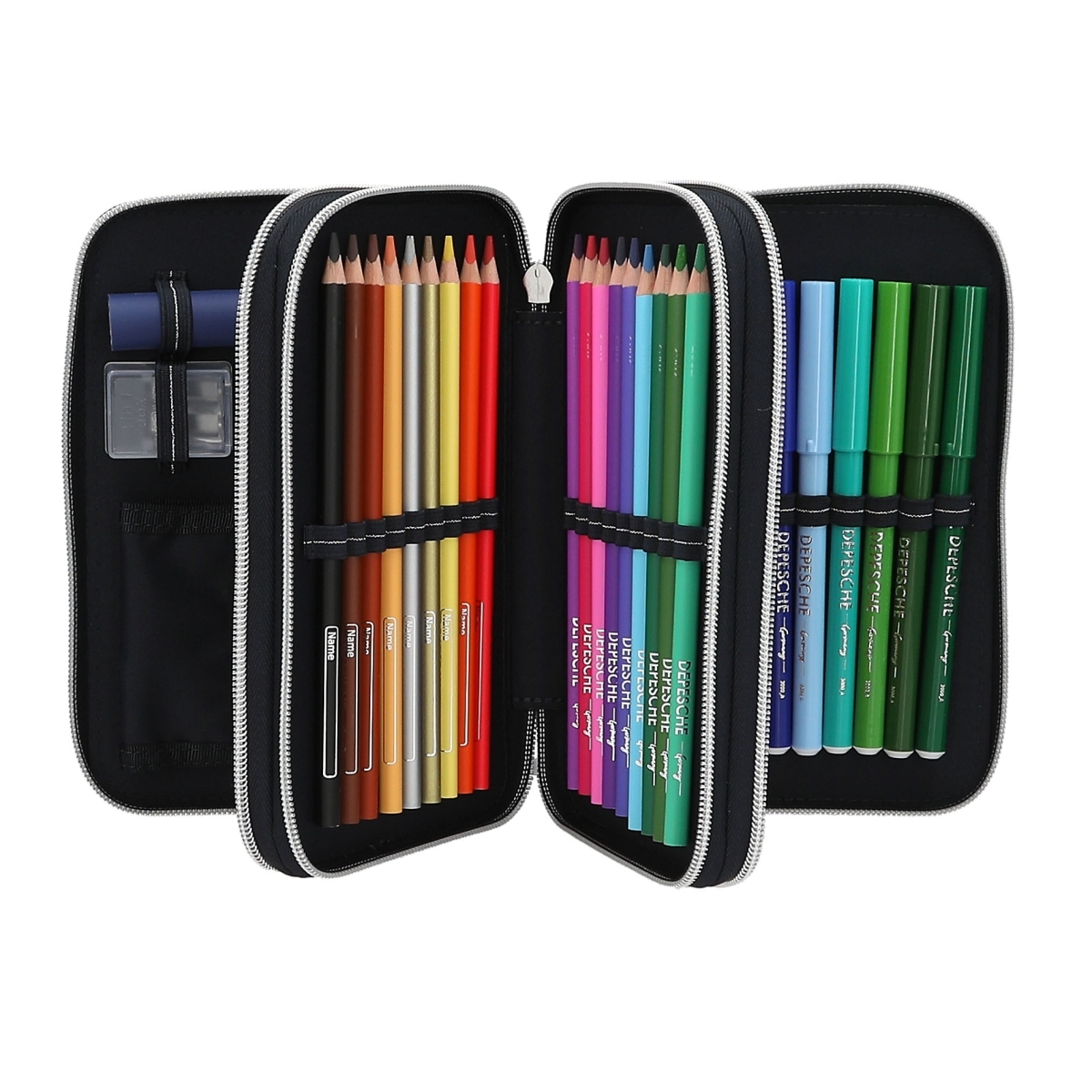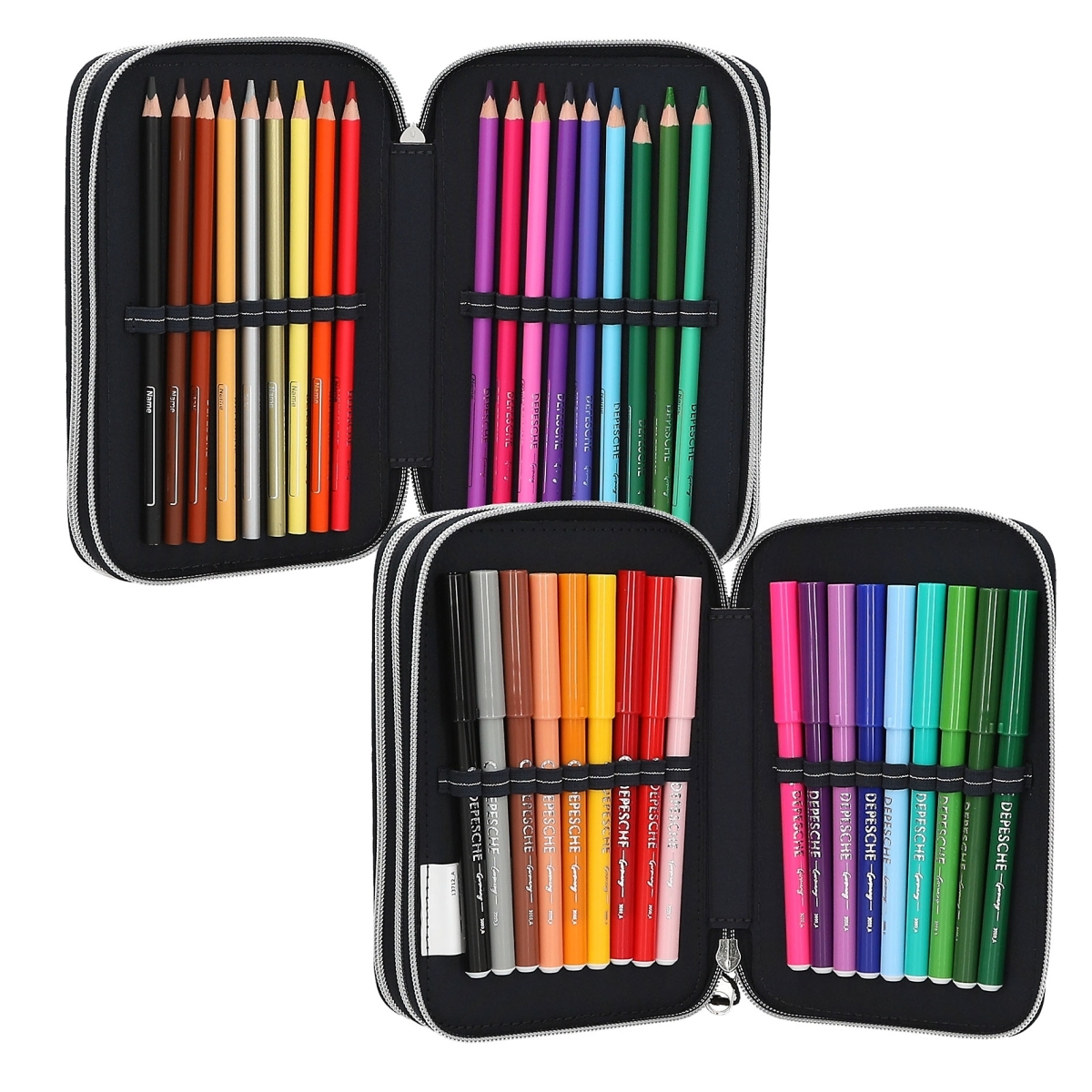 Penalhuset er opdelt i tre rum og fyldt med alt, hvad man skal bruge til at tegne og skrive med i skolen og derhjemme: 2 blyanter, 1 saks, 1 lineal, 1 viskelæder, 1 blyantspidser, 18 farveblyanter og 18 tuscher samt en lille pung med velcro. Inkl. sejt lynlåsvedhæng formet som en gaming controller.