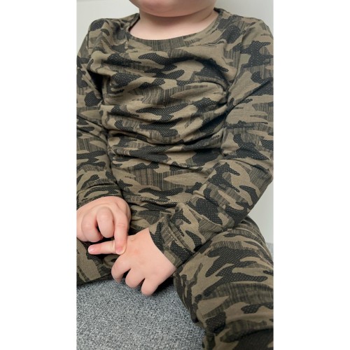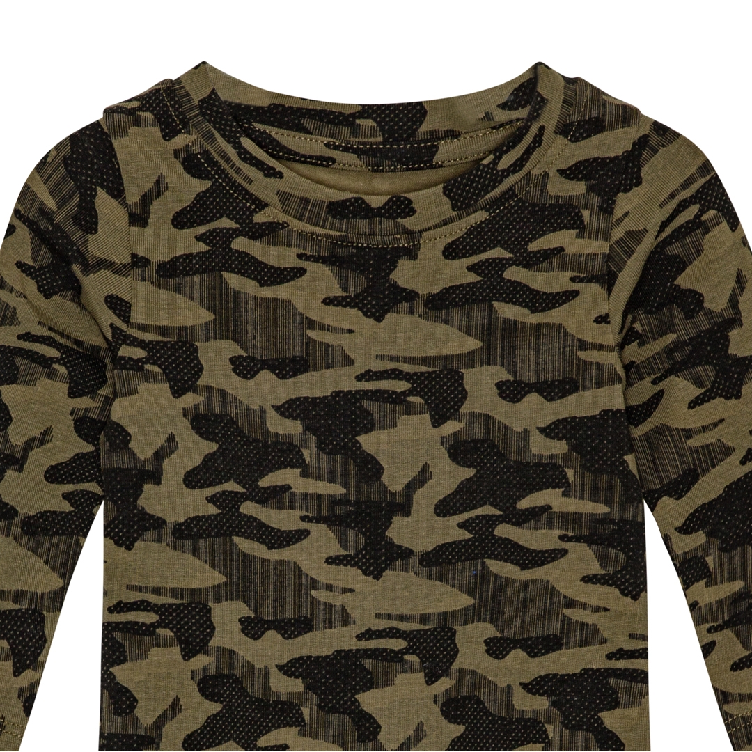 Super fed langærmet body fra det danske mærke Birkholm, med et sejt grønt army print over det hele. Den er lavet i en skøn blanding af bomuld og elastan, der gør den utroligt blød, men med masser af stræk, så den sidder godt til uden at klemme. Lukning med trykknapper imellem benene.