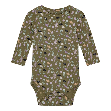 Super smuk grøn langærmet body fra det danske mærke Birkholm, med et skønt allover print af vilde blomster. Den er lavet i en skøn blanding af bomuld og elastan, der gør den utroligt blød, men med masser af stræk, så den sidder godt til uden at klemme. Lukning med trykknapper imellem benene.