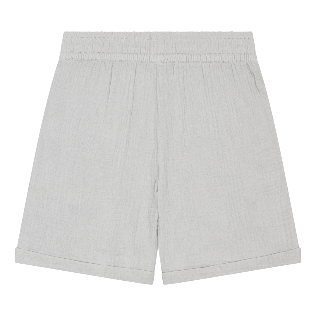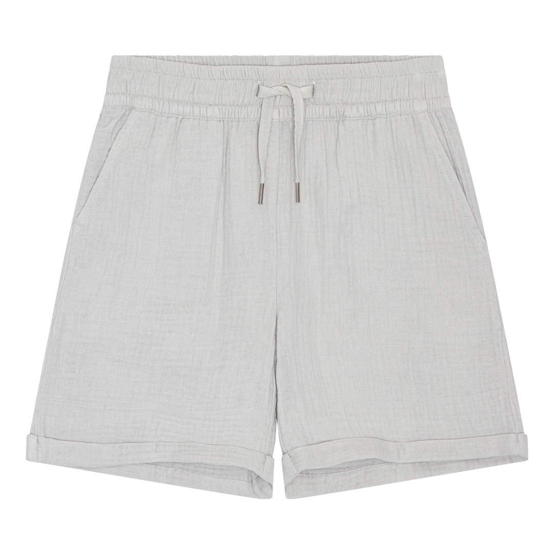 Mega fede grå muslin shorts fra det danske mærke Birkholm. Snøre i livet, justbar elastik i taljen, lommer i begge sider og et lille opsmøg nederst.