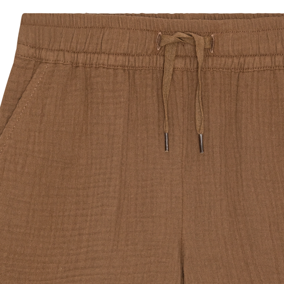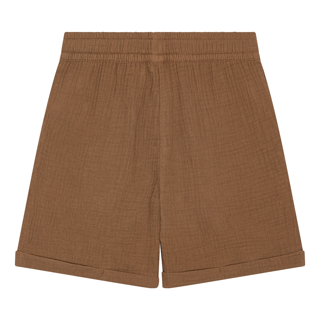 Mega fede brune muslin shorts fra det danske mærke Birkholm. Snøre i livet, justbar elastik i taljen, lommer i begge sider og et lille opsmøg nederst.
