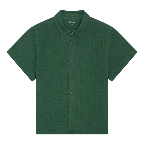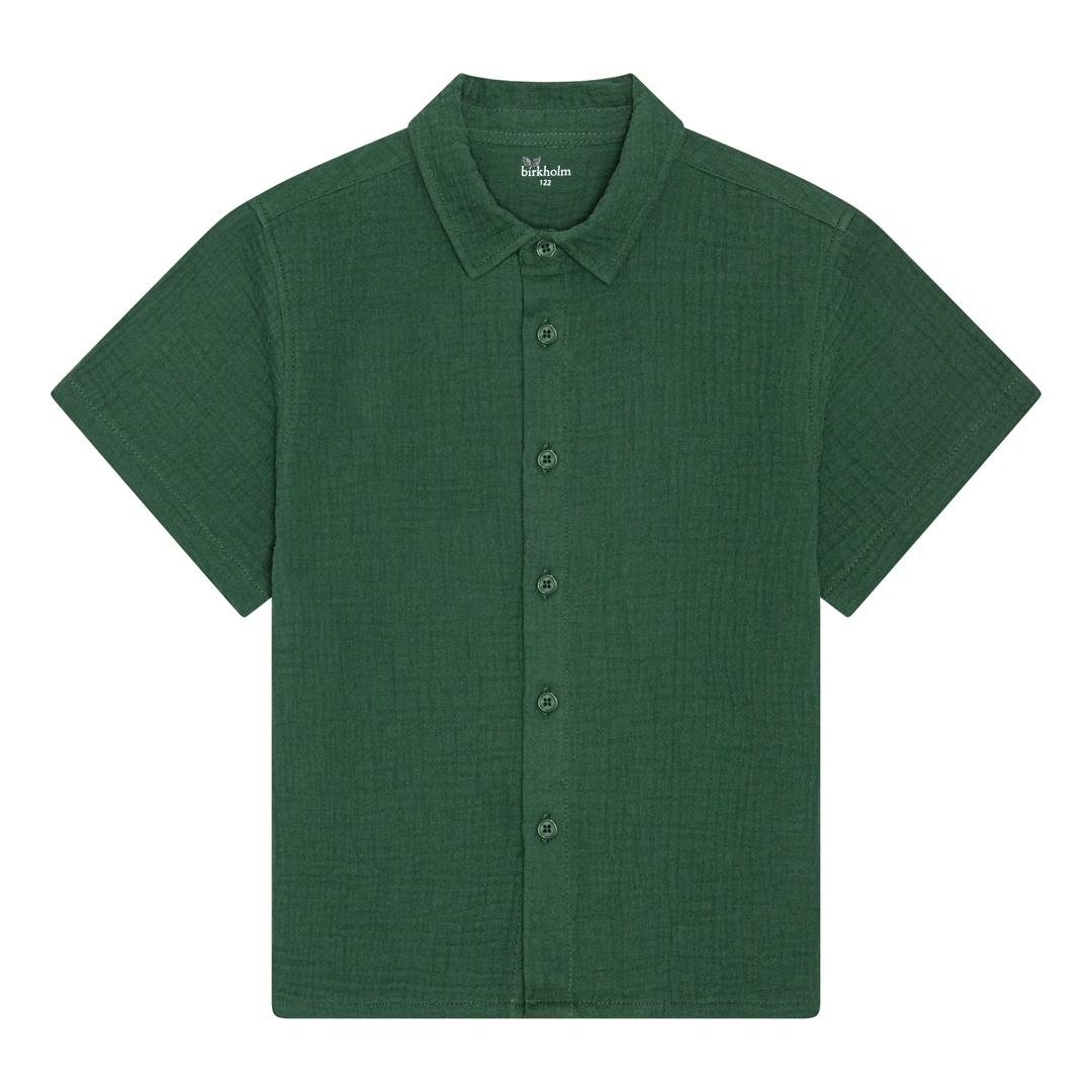 Mega fed grøn muslin skjorte fra det danske mærke Birkholm med knaplukning ned langs maven, en lille krave og korte ærmer.
