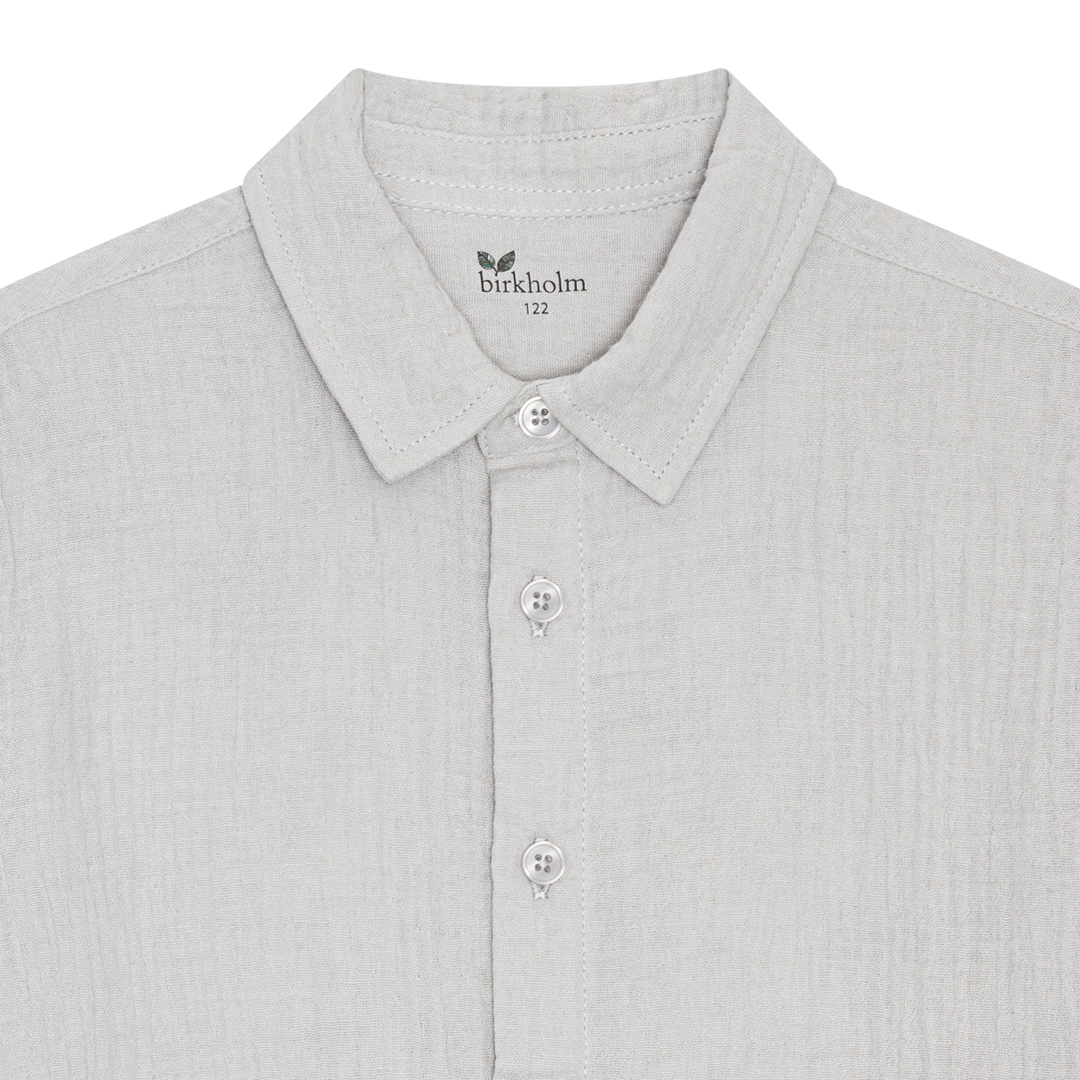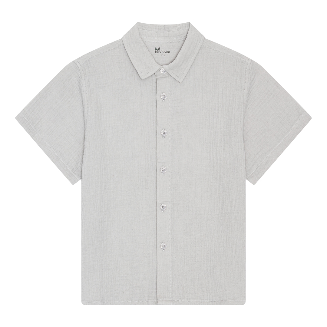 Mega fed grå muslin skjorte fra det danske mærke Birkholm med knaplukning ned langs maven, en lille krave og korte ærmer.