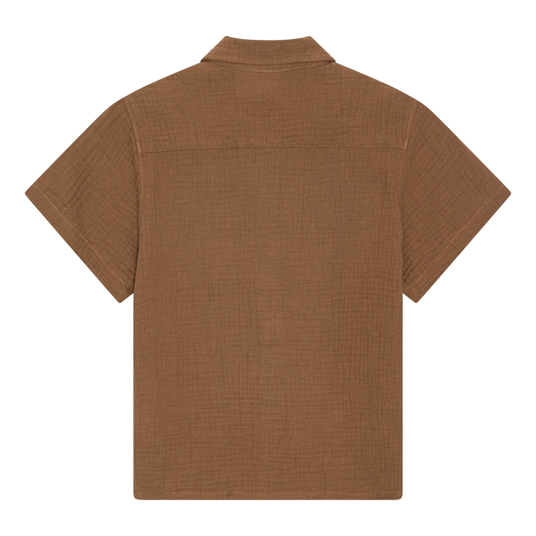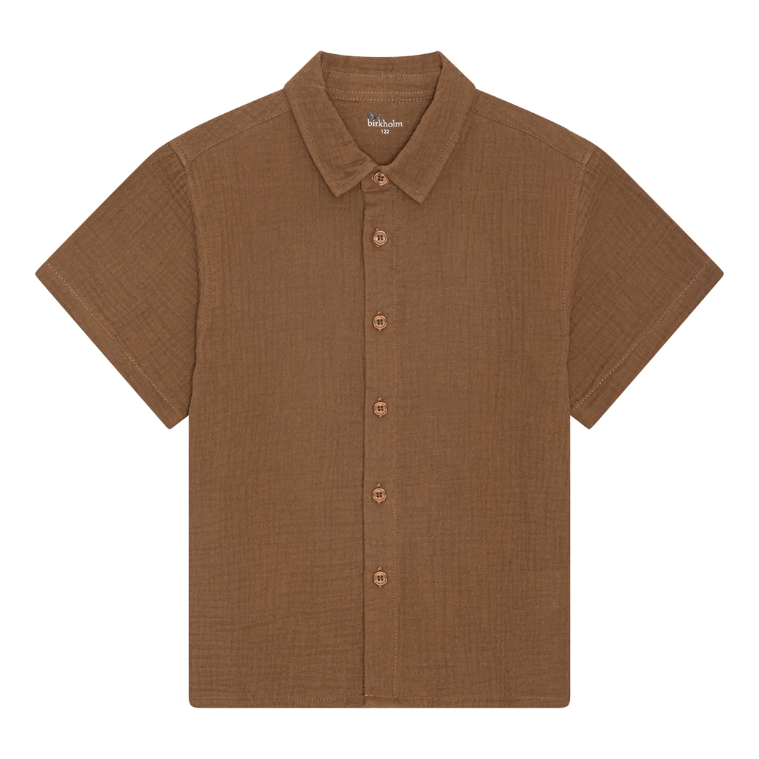 Mega fed brun muslin skjorte fra det danske mærke Birkholm med knaplukning ned langs maven, en lille krave og korte ærmer.