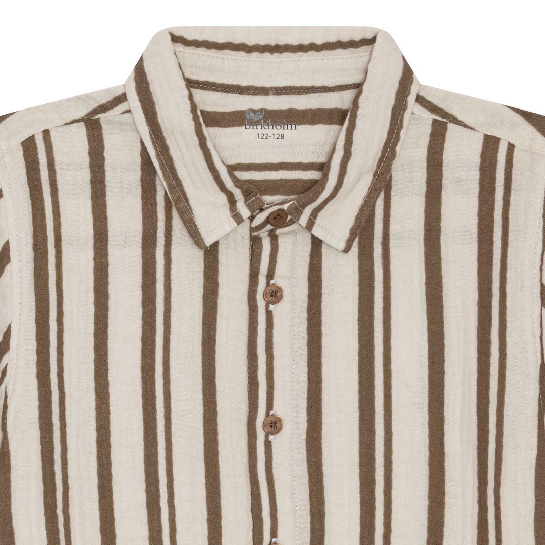 Mega fed stribet muslin skjorte fra det danske mærke Birkholm med knaplukning ned langs maven, en lille krave og korte ærmer.