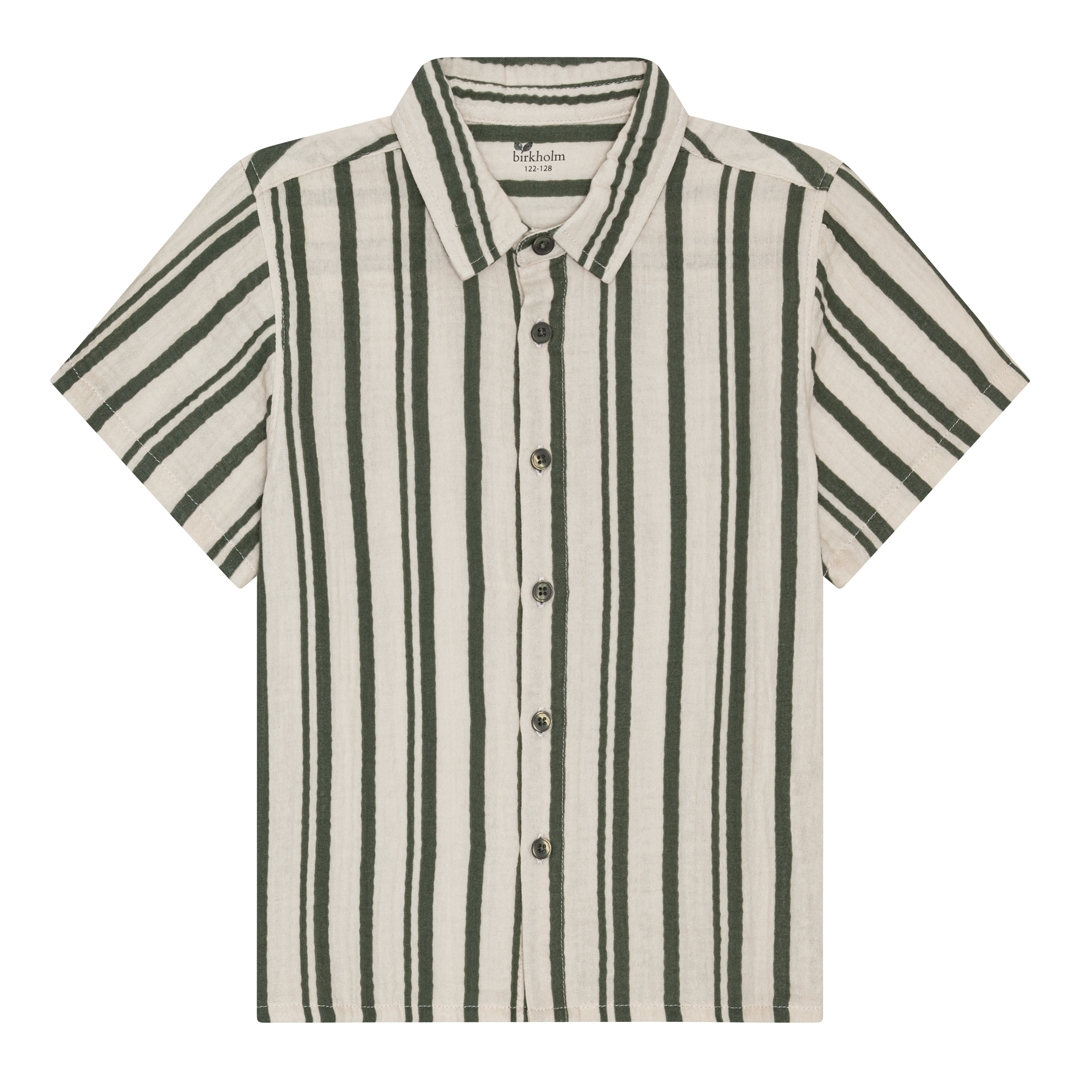 Mega fed stribet muslin skjorte fra det danske mærke Birkholm med knaplukning ned langs maven, en lille krave og korte ærmer.