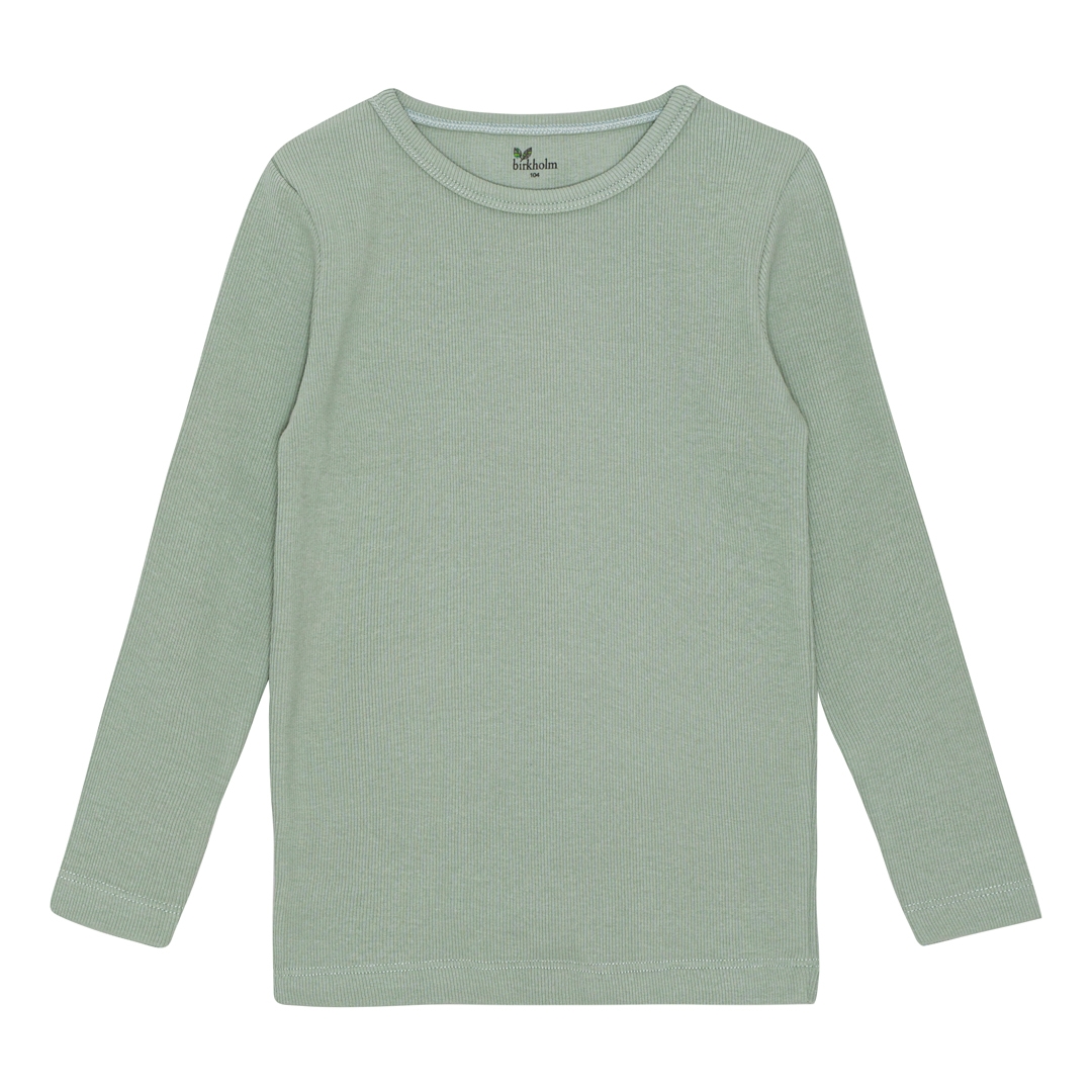 Grøn langærmet rib bluse fra det danske mærke Birkholm. Lavet med masser af stræk i stoffet, så den sidder godt til uden at klemme. Super høj kvalitet, dejligt blødt stof og god åndbarhed. Et must-have til ungernes basis garderobe.