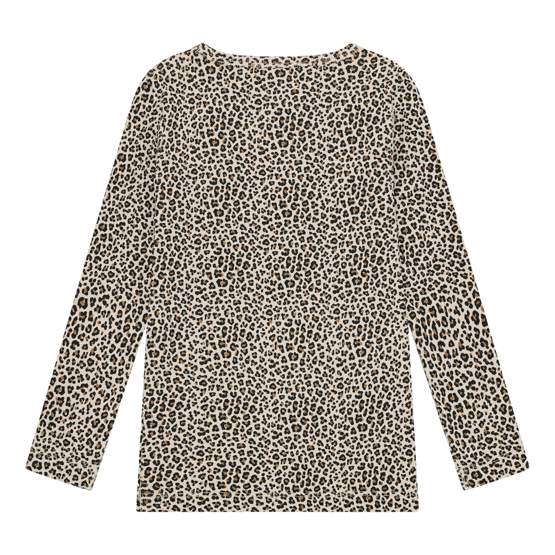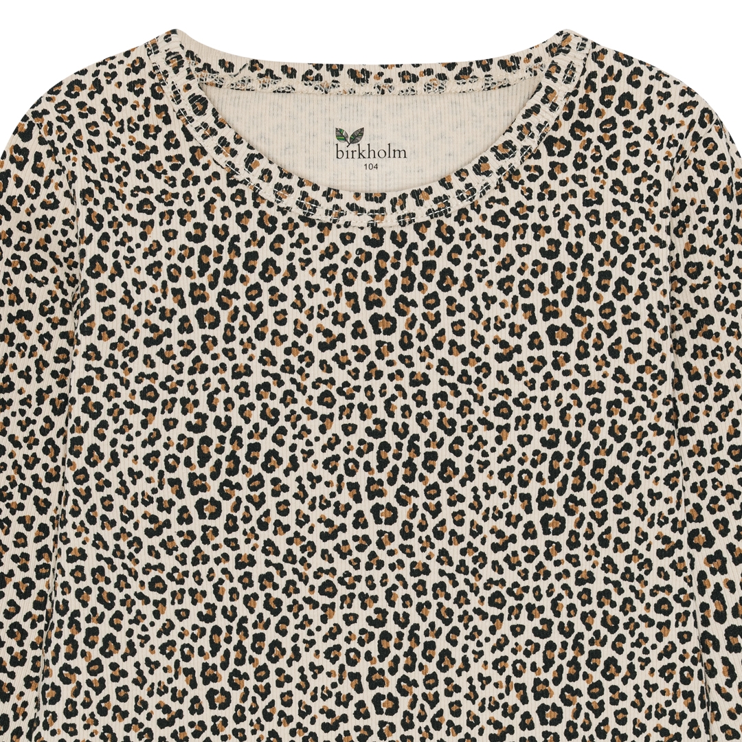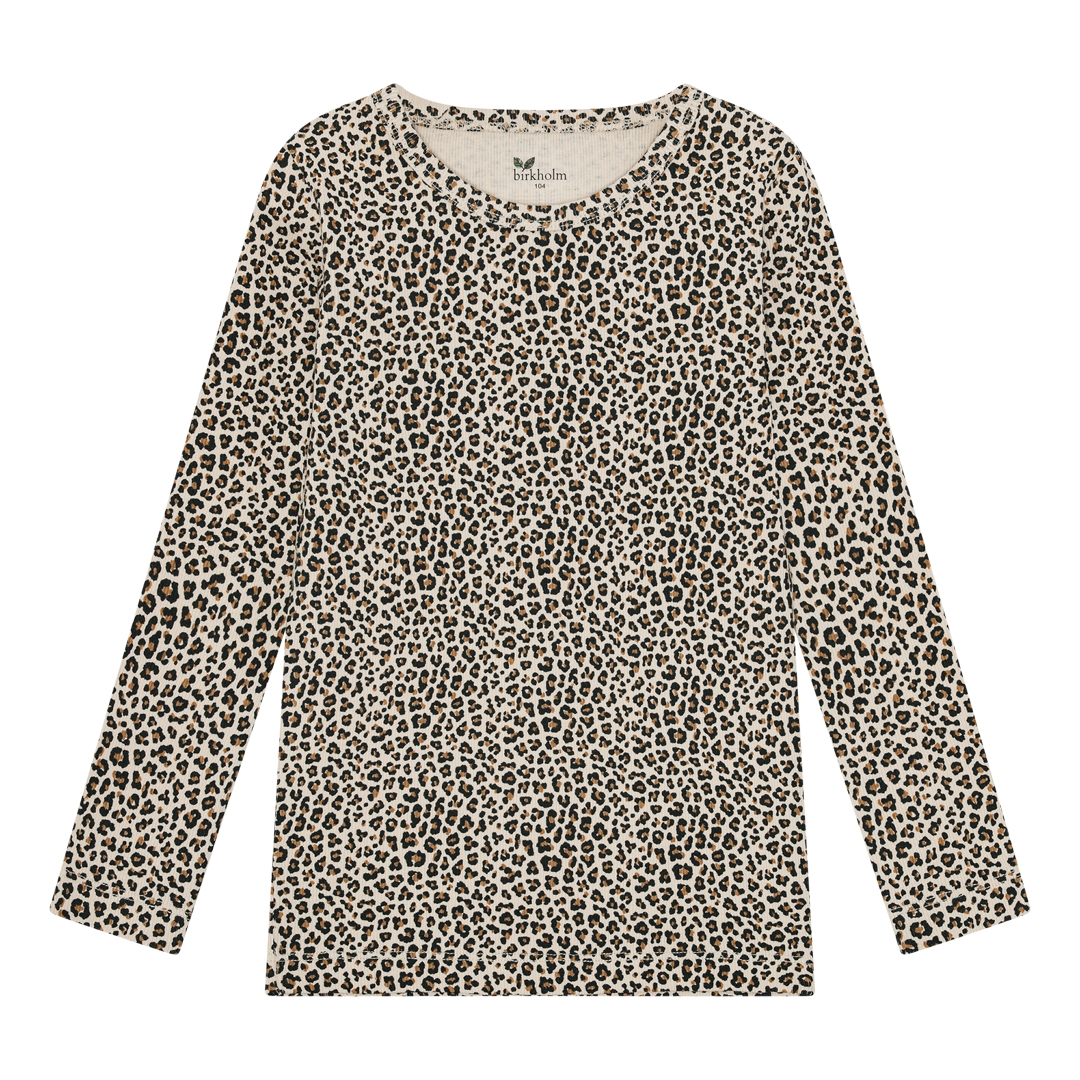 Langærmet rib bluse fra det danske mærke Birkholm med at skønt allover leopard print. Lavet med masser af stræk i stoffet, så den sidder godt til uden at klemme. Super høj kvalitet, dejligt blødt stof og god åndbarhed. Et must-have til ungernes basis garderobe.