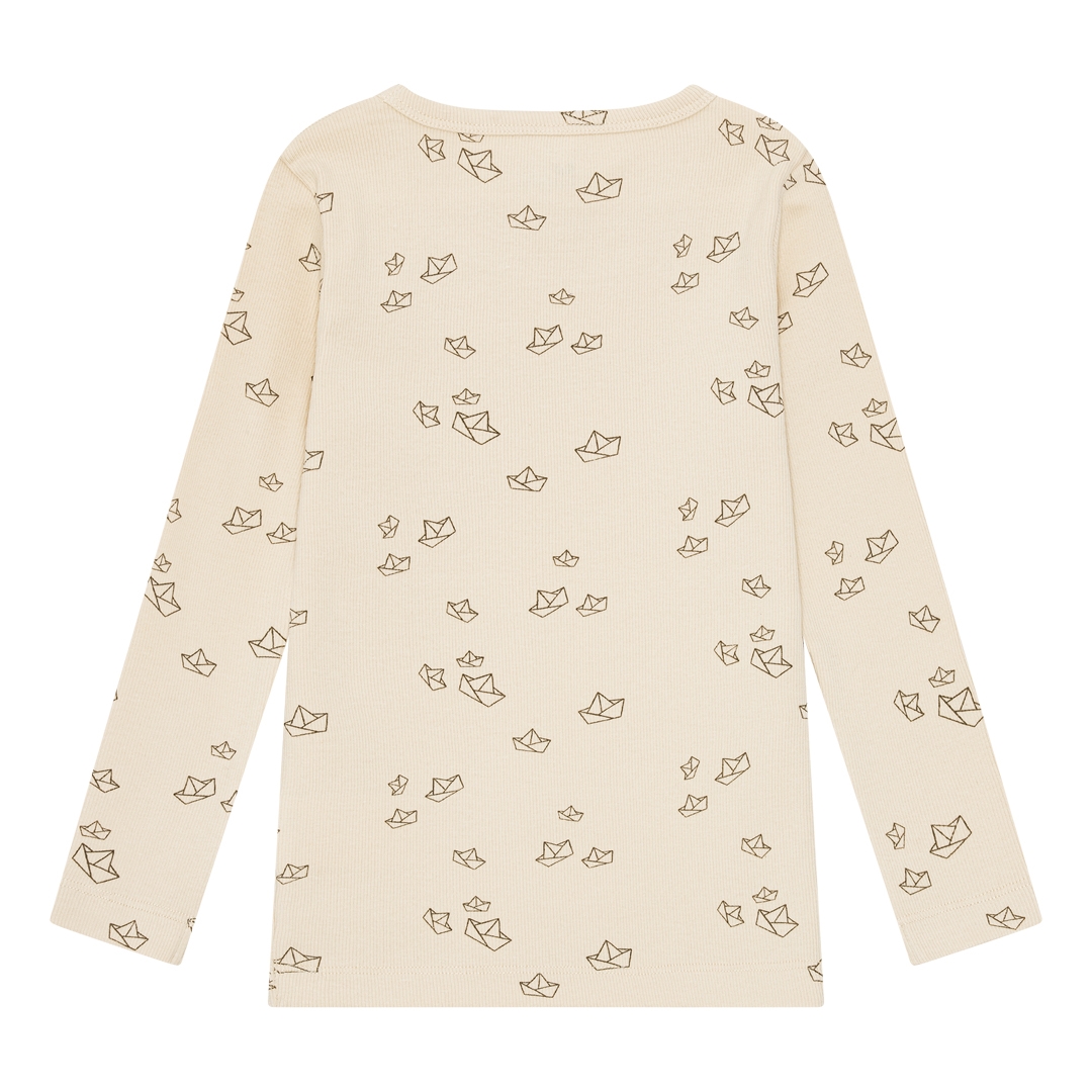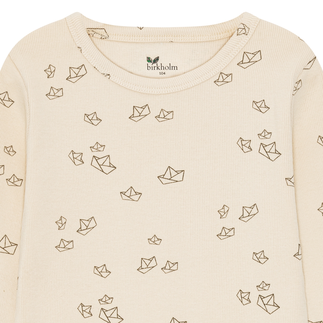 Langærmet rib bluse fra det danske mærke Birkholm med at skønt allover print af papirsbåde. Lavet med masser af stræk i stoffet, så den sidder godt til uden at klemme. Super høj kvalitet, dejligt blødt stof og god åndbarhed. Et must-have til ungernes basis garderobe.