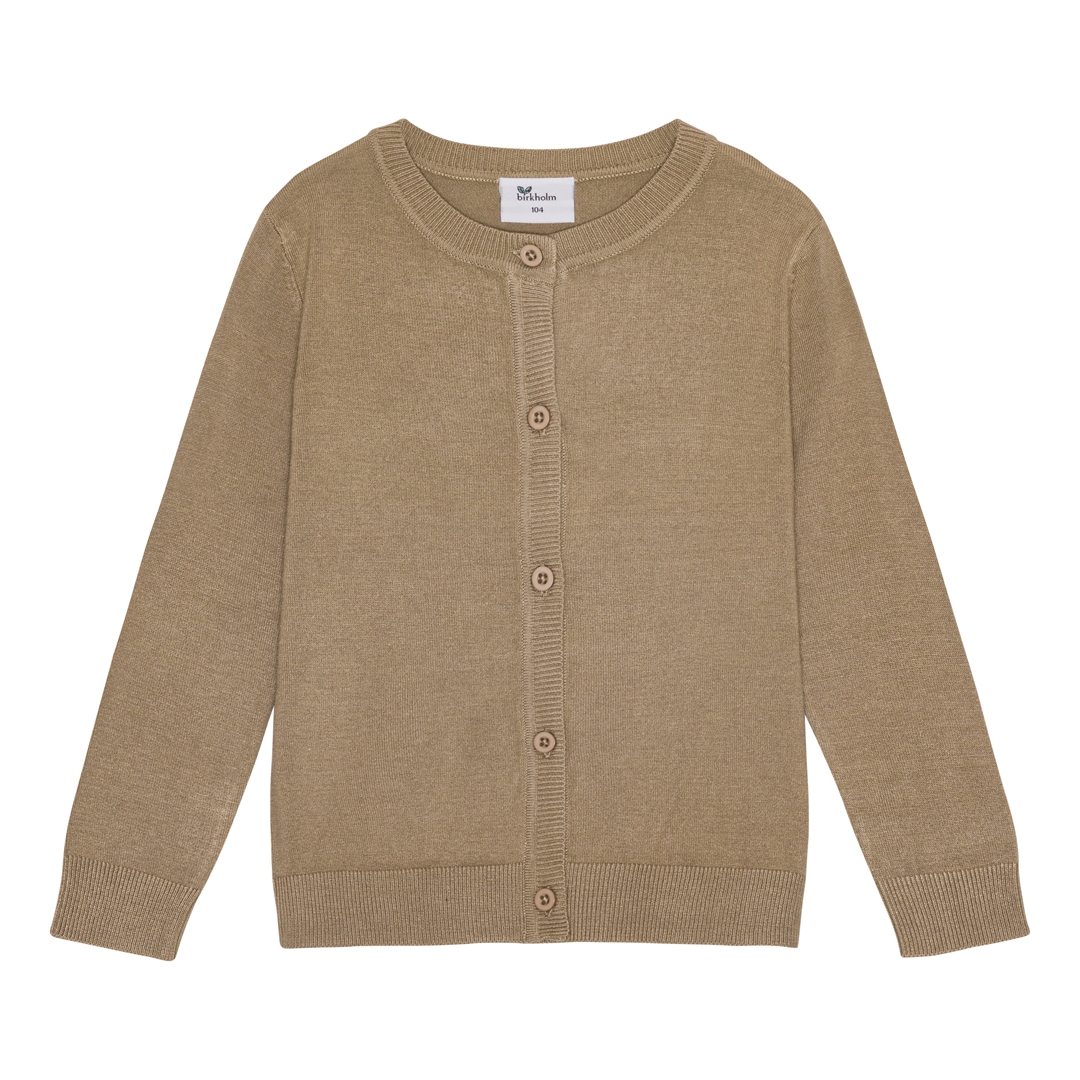 Super fed ensfarvet brun strik cardigan fra det danske mærke Birkholm. Rund hals, lukning med knapper ned langs maven og ribkanter i bunden og ved ærmerne. Den er lavet i en blød blanding af viskose og nylon, og er et absolut must-have i pigernes basis garderobe året rundt.