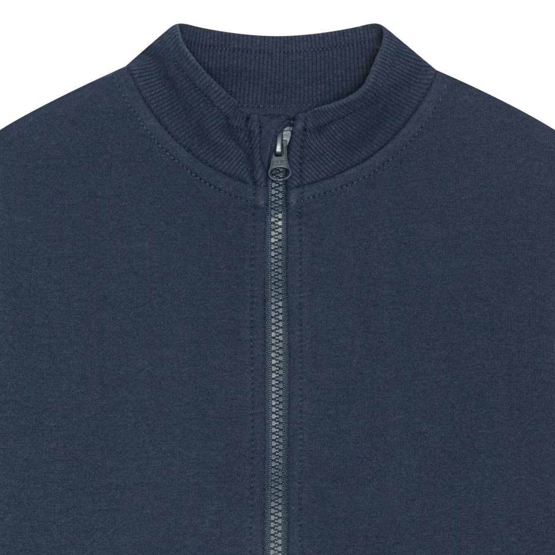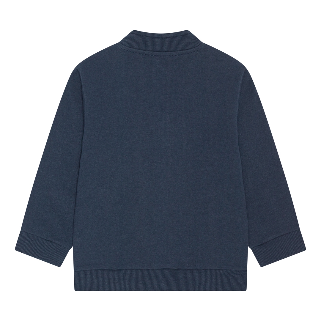 Fantastisk mørkeblå sweat cardigan uden hætte fra det danske mærke Birkholm. Semihøj hals, lange ærmer og rib i alle kanter og lukning med lynlås ned langs maven. Lynlåsen er naturligvis med hagebeskytter øverst. Kvaliteten af denne cardigan er helt i top, og den er skræddersyet til dagligt aktivt brug. Den har et normalt fit som passer de fleste, og den smarte blå farve er nem at matche op imod. Et absolut must-have i ungernes basis garderobe.