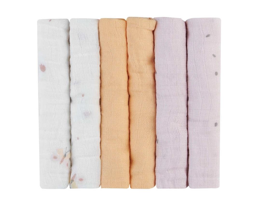 Lækker æske med 6 stofbleer i 3 forskellige prints og farver. De er i blød og lækker kvalitet, måler 30 x 30 cm.