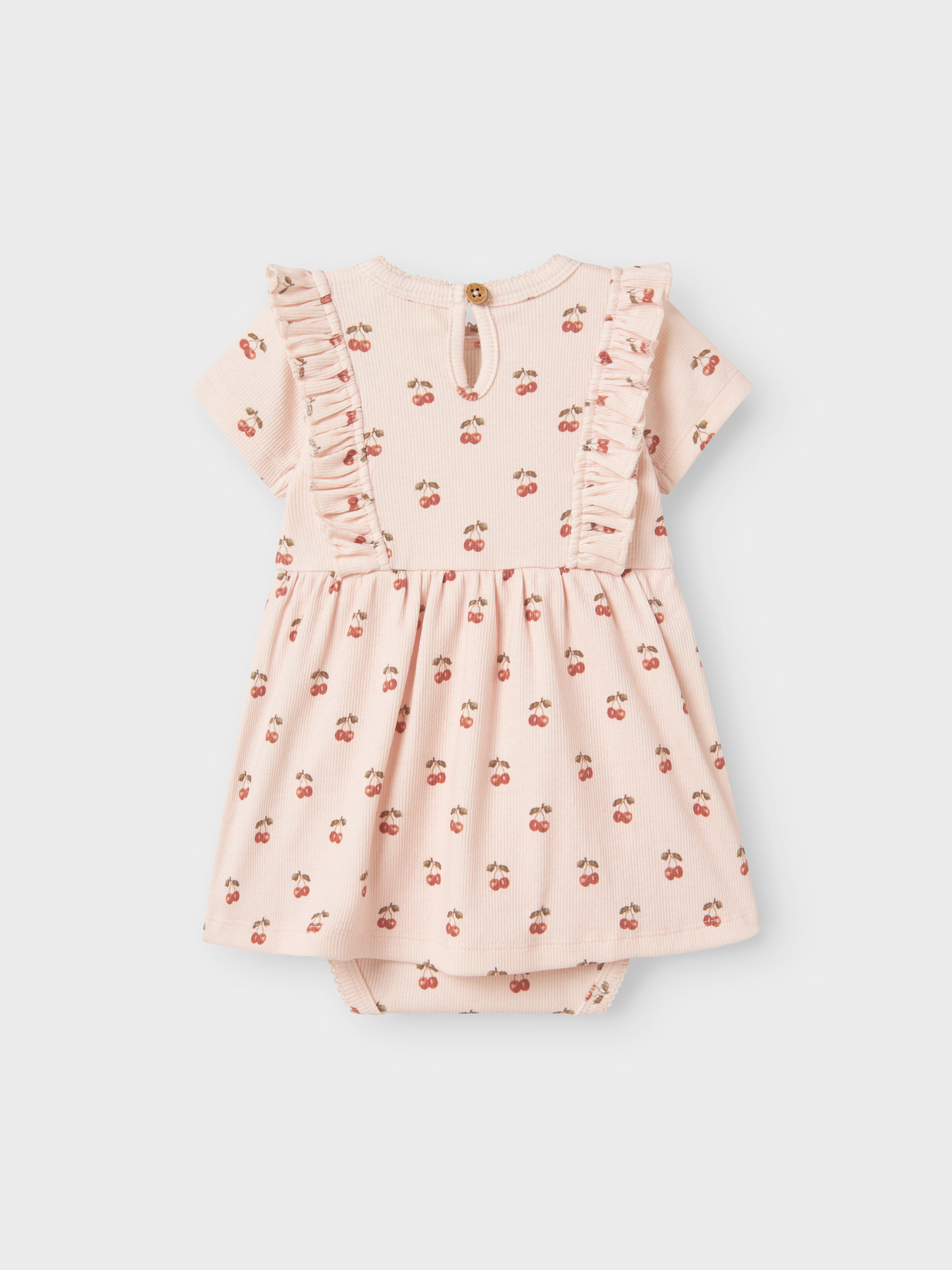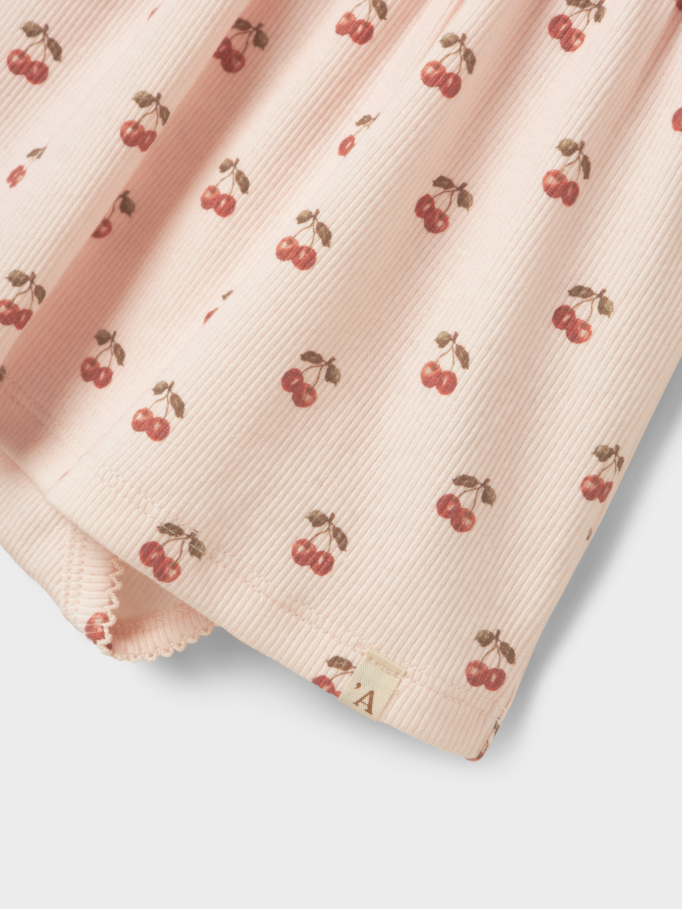 Skøn kjole med body under fra Lil Atelier. Den er med korte ærmer og i lækker rib kvalitet. Den er med det sødeste kirsebær print og fin hul knap lukning i nakken.