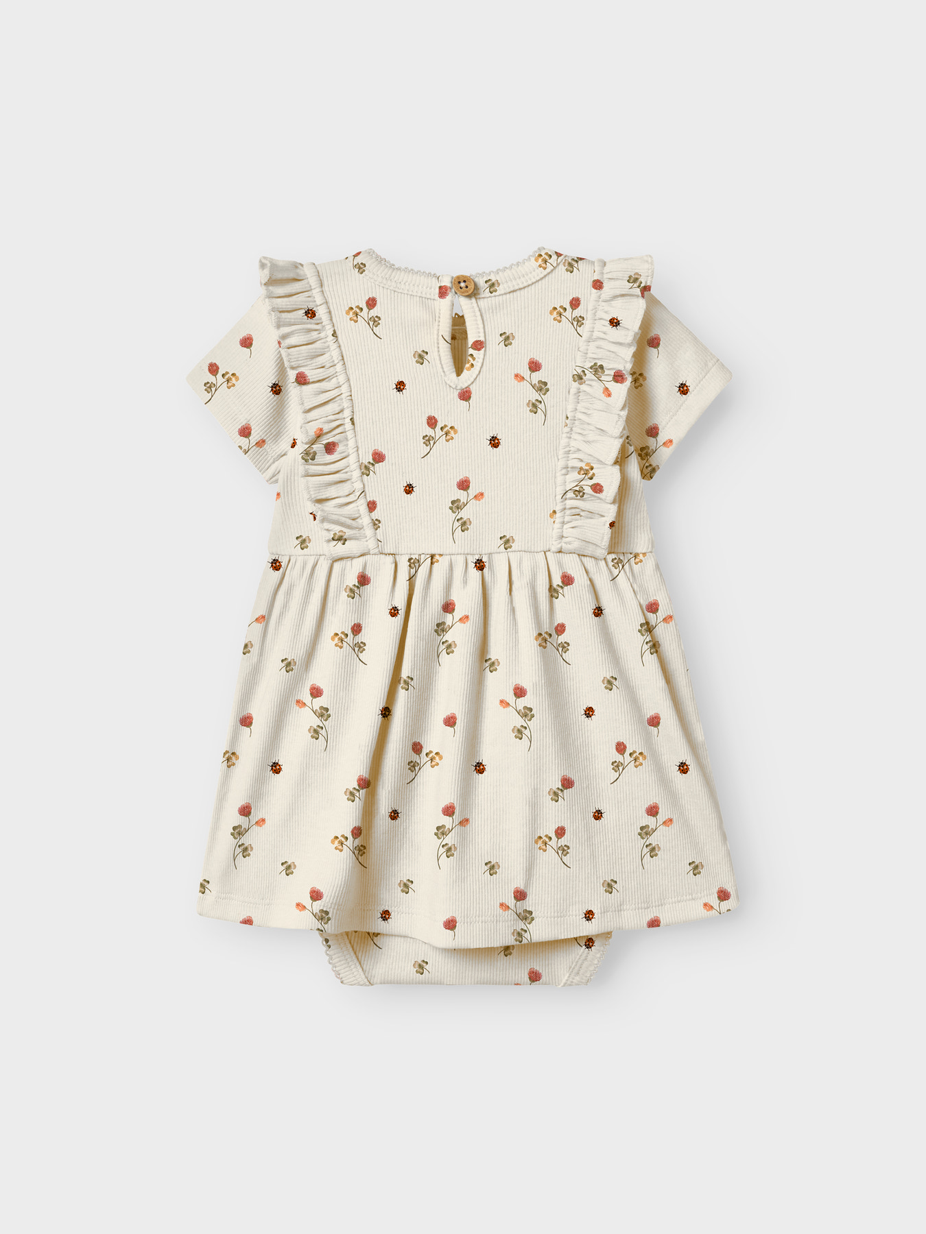 Skøn kjole med body under fra Lil Atelier. Den er med korte ærmer og i lækker rib kvalitet. Den er med det sødeste blomster print og fin hul knap lukning i nakken.