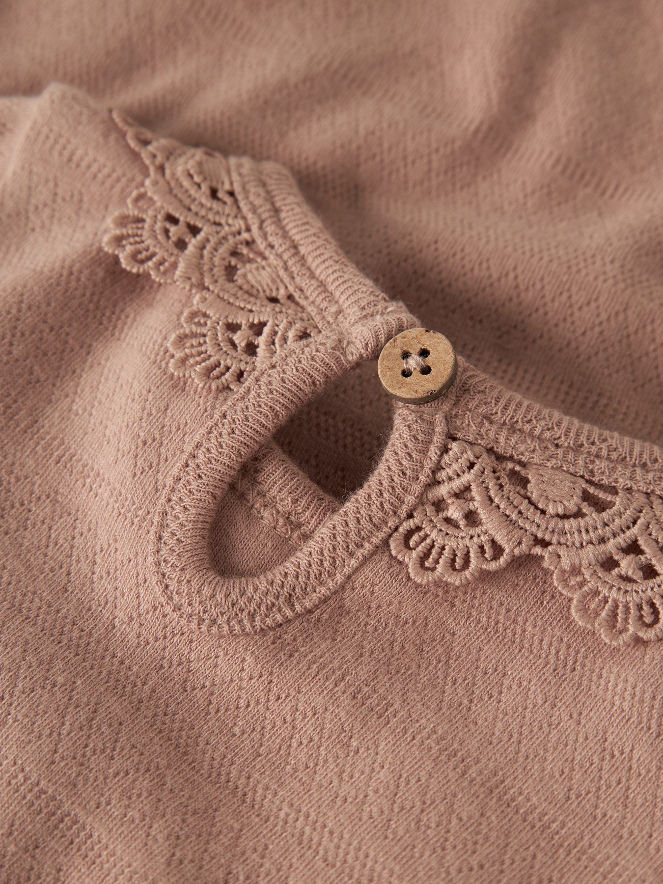 Bodystocking i hulmønster kvalitet, som skaber unikke mønstre og et charmerende udtryk. Den har rund hals, lange ærmer og praktiske trykknapper ved skulder, samt fine blonde detaljer, der giver et stilfuldt og komfortabelt look.