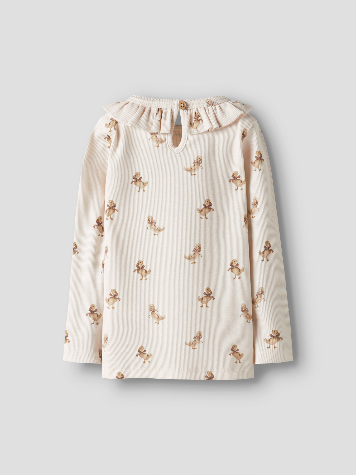 Super sød bluse fra Lil Atelier med flæsekrave, lukning i nakken og et skønt allover print af gæs.