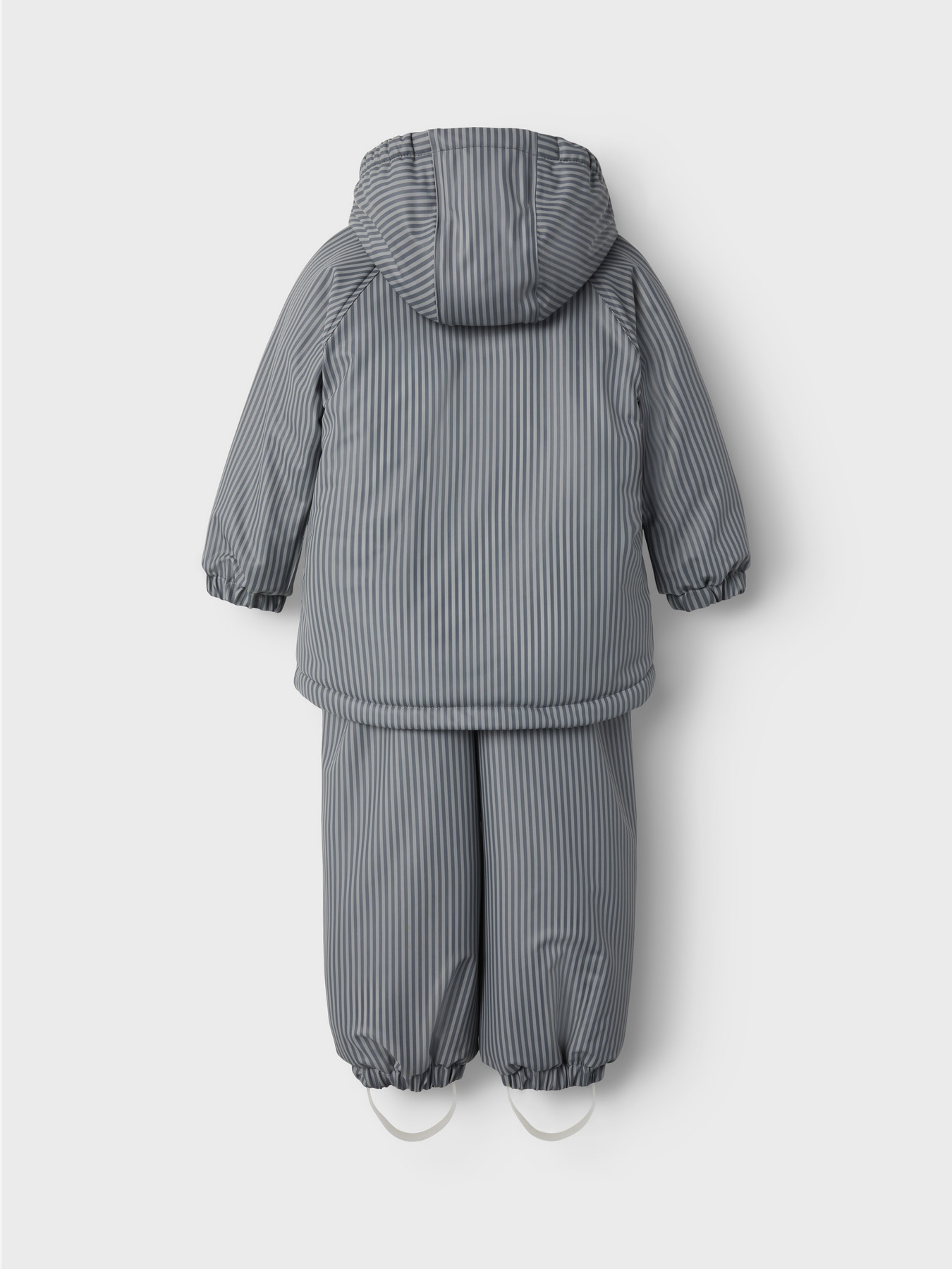 Super lækkert polstret regnsæt fra Lil Atelier med striber. Regnjakken har aftagelig hætte, lynlås ned langs maven der kan skjules med trykknapper og reflekser. Regnbukserne er med seler, aftagelige og justérbare fodstropper, reflekser og funktionelle lommer.