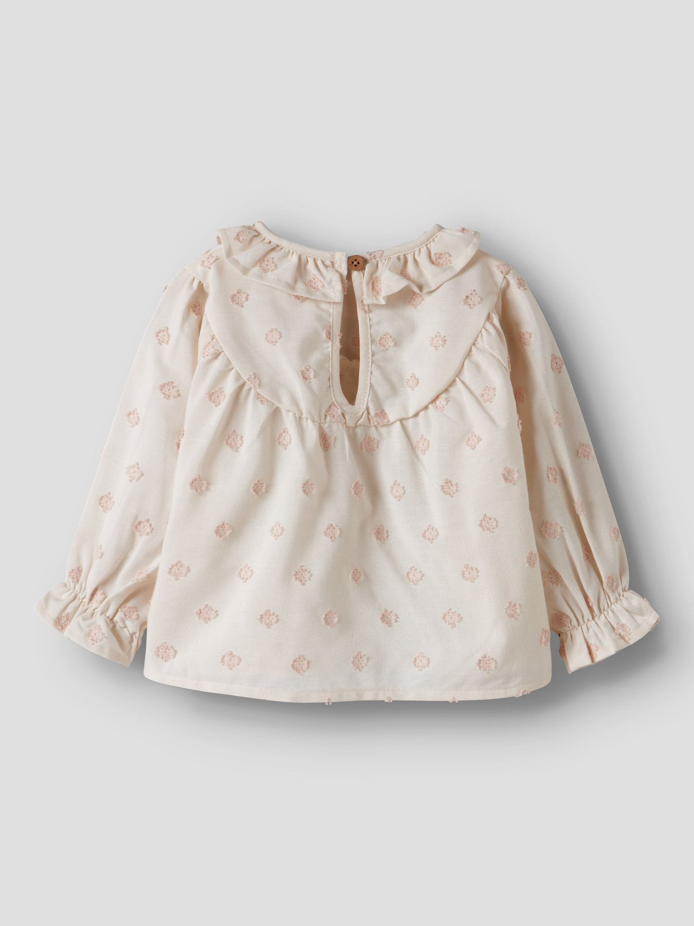 Den sødeste skjorte bluse fra lil atelier, den er i en skøn lys farve. Den lukkes bagpå med en knap.