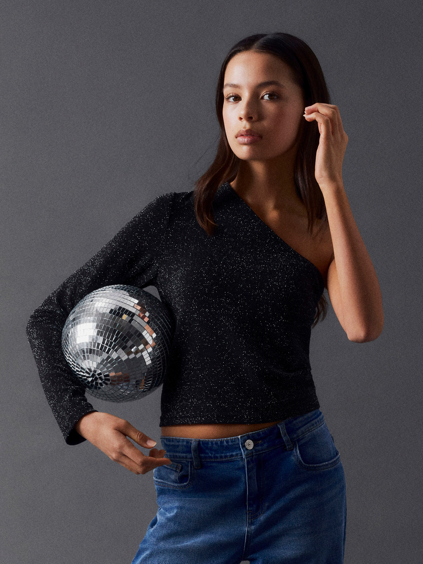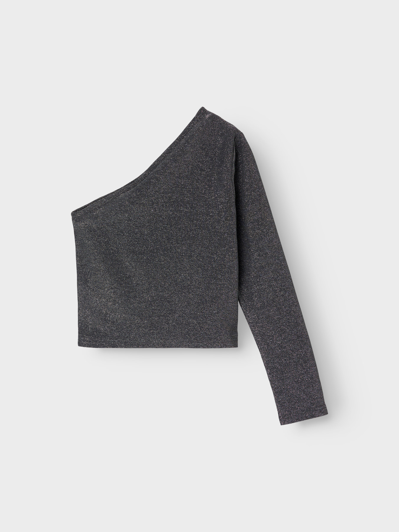 Mega smuk one shoulder bluse fra LMTD. Den er i flot glimmer materiale, perfekt til alle de festlige dage.
