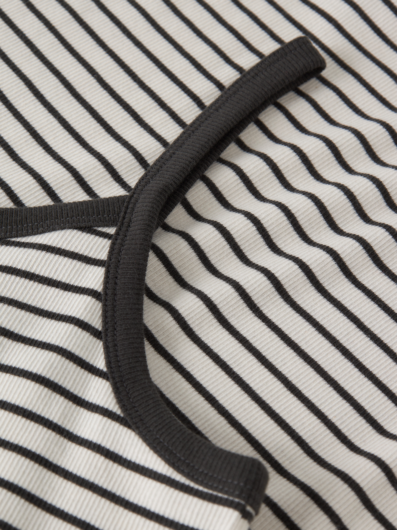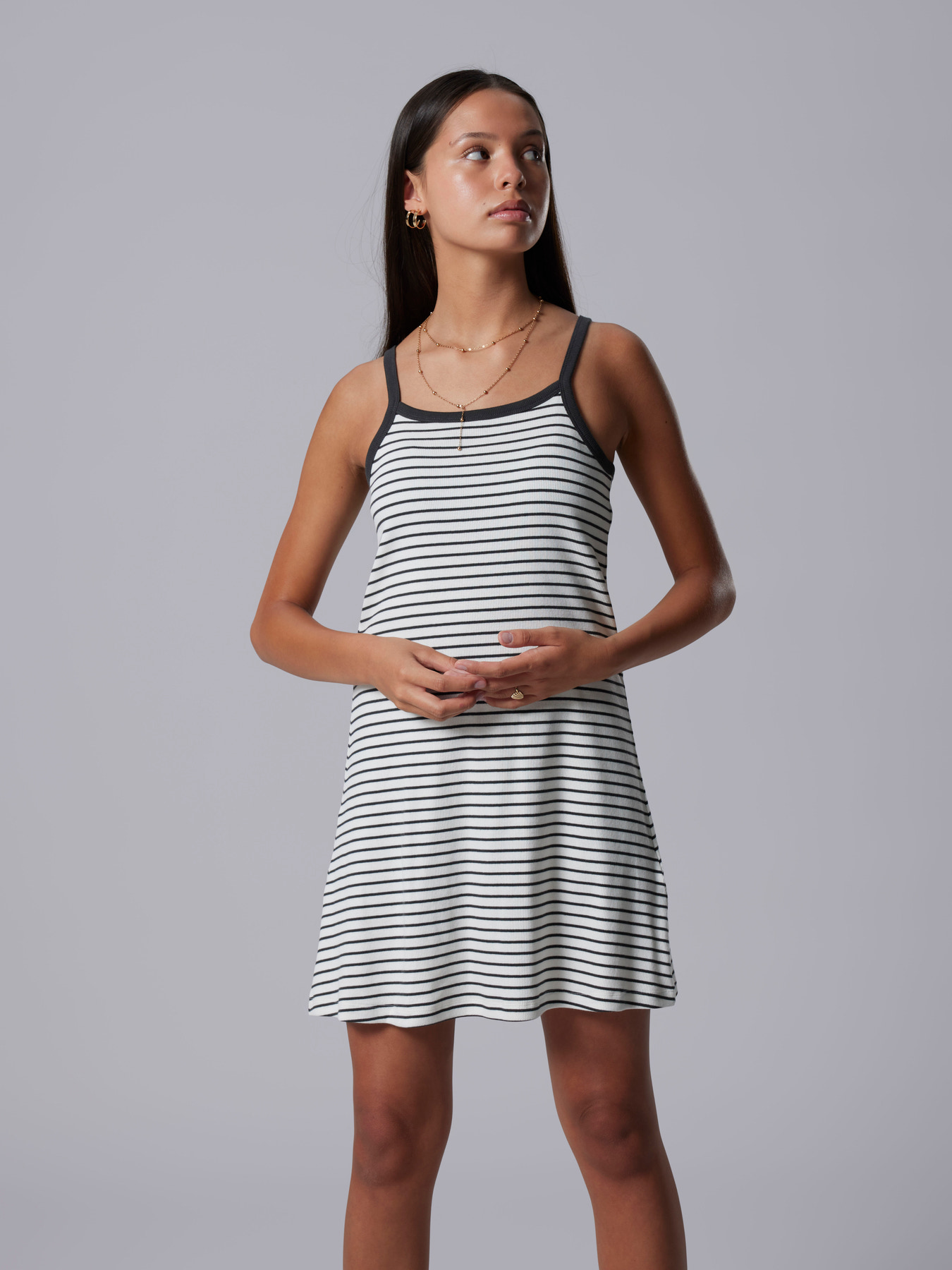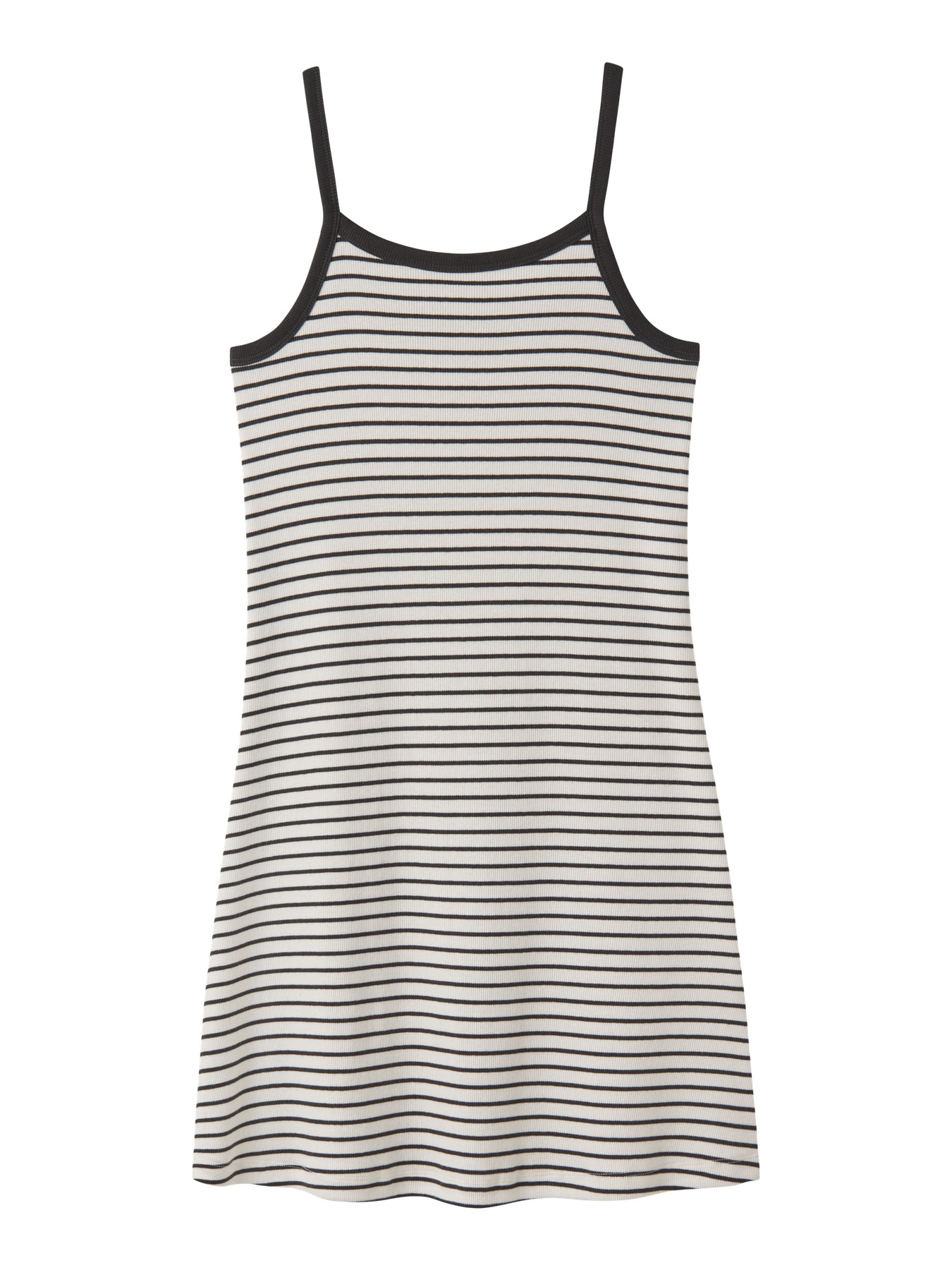 Trendy og luftig kjole, perfekt til solrige dage og lune aftener. Den er lavet i ribstrik med en lodret, stribet struktur og god elasticitet, som giver en behagelig pasform og et tidløst look. Kjolen har U-udskæring, er ærmeløs og har kort længde samt slim fit, der giver et stilrent og moderne udtryk.