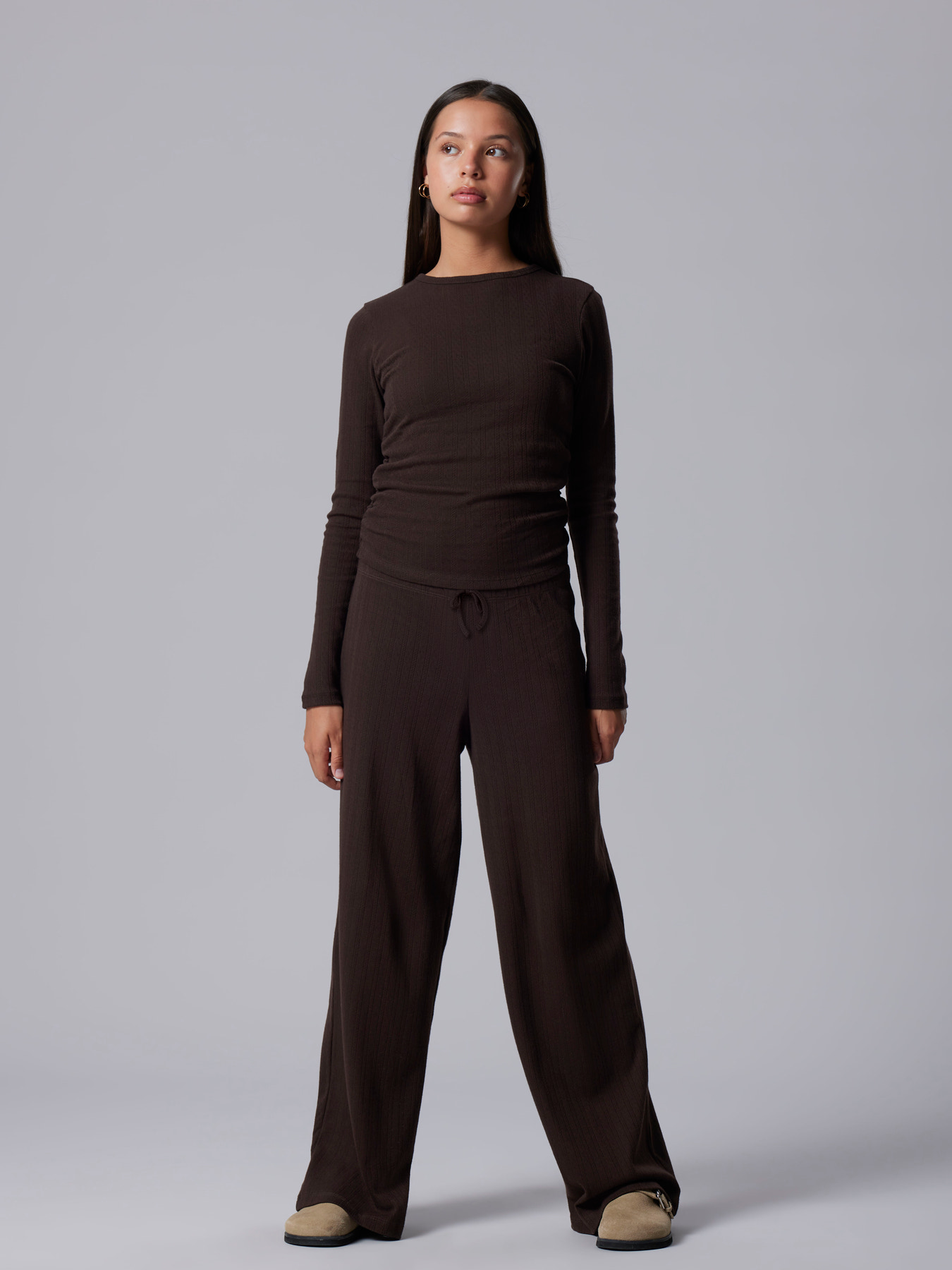 Dejlig bløde wide bukser fra LMTD, de er i en flot brun farve og med et smukt hulmønster mønster.