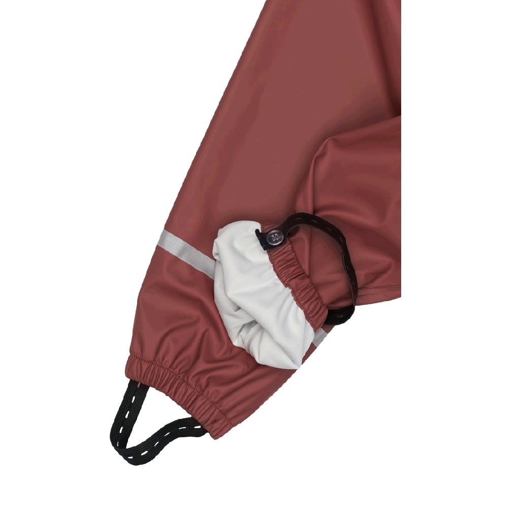 Super lækkert rødt regnsæt fra Mikk-Line. Jakken er med hagebeskyttet lynlåslukning ned langs maven, fleece foer og med elastik i ærmerne så den lukker godt til. Bukserne er med aftagelige fodstropper og elastiske manchetter ved åbningerne. Sætter har refleks detaljer flere steder for maksimal sikkerhed.