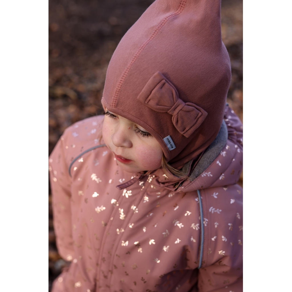 Super sød ensfarvet Mikk-line elefanthue med en fin sløjfe på fronten og vindstop ved ørerne. Huen dækker det meste af barnets hoved, hals og ansigt, så den beskytter barnet mod kulde og vind, når det leger og udforsker naturen under den åbne himmel.