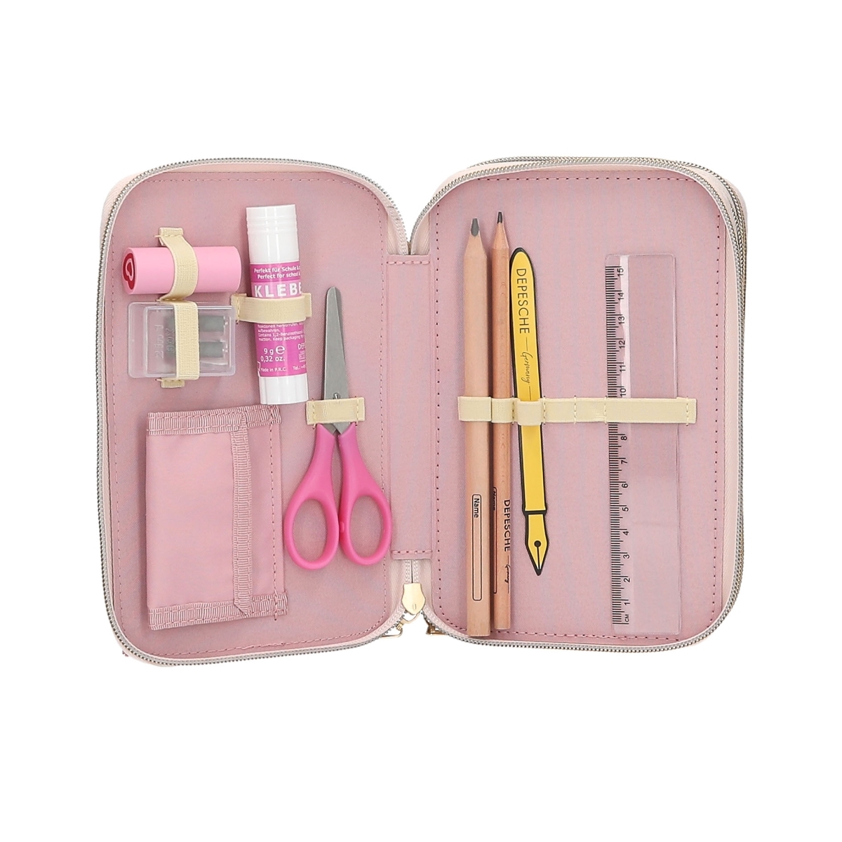 Et virkelig flot og praktisk, trefløjet penalhus fra Miss Melody i lys gul med guld og rosa detaljer og med en smuk, brun hest på forsiden med en applikeret blød, hvid man. Penalhuset er opdelt i tre store rum og er fyldt med alt, hvad man skal bruge til at tegne og skrive med både i skolen og derhjemme som saks, lim, lineal, viskelæder, blyantspidser, blyanter, 18 farveblyanter og farvetuscher.