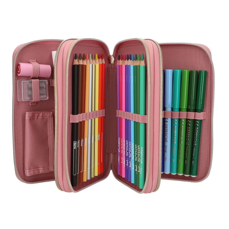 Et virkelig flot, trefløjet penalhus fra Miss Melody Dusty Rose-serien med motiv af to smukke heste på fronten sammen med en påsat, gylden, dekorativ trenselignende lukning og lyst, kunstigt læder på siden. Penalhuset indeholder tre store rum, der er fyldt med alt, hvad man skal bruge til at tegne og skrive med både i skolen og derhjemme, som bla. saks, lim, lineal, viskelæder, blyantspidser, blyanter, 18 farveblyanter og farvetuscher og meget mere.