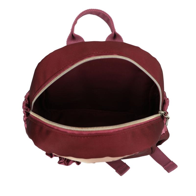 Smuk rygsæk fra Miss Melody serien i varme rødlige nuancer med rosa kontrastfarver og med et drømmende, smukt hestemotiv af tre heste i aftensol. Rygsækken har et rummeligt hovedrum, to sidelommer til bl.a. drikkeflaske, bærehank samt justerbare, polstrede skulderremme samt en stor frontlomme med fine flæsedetaljer. Mål: 10 x 23 x 26 cm.