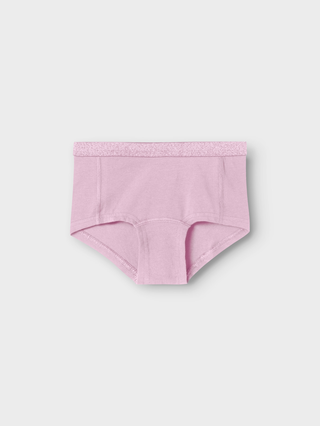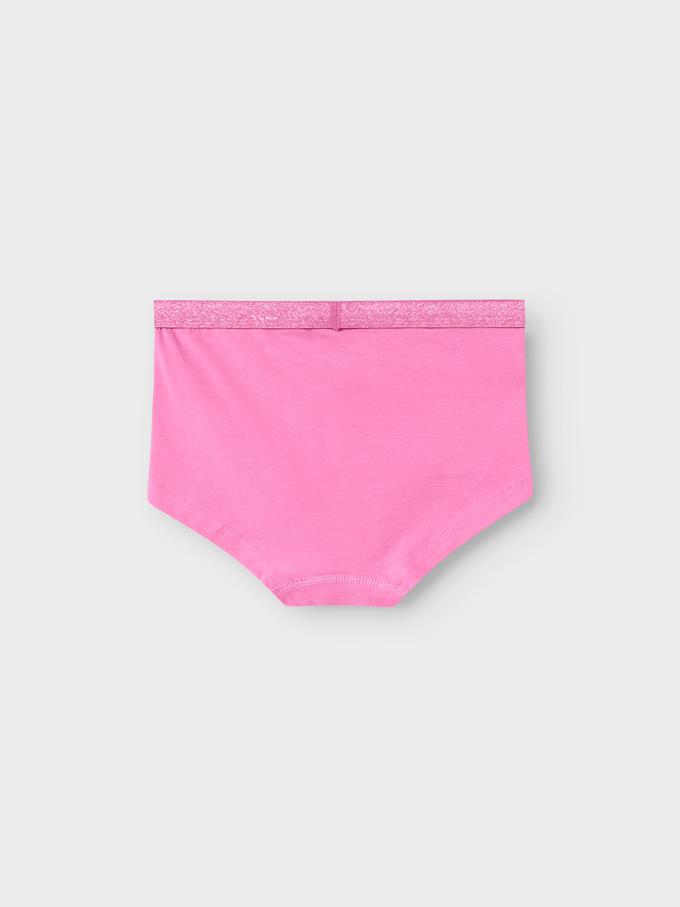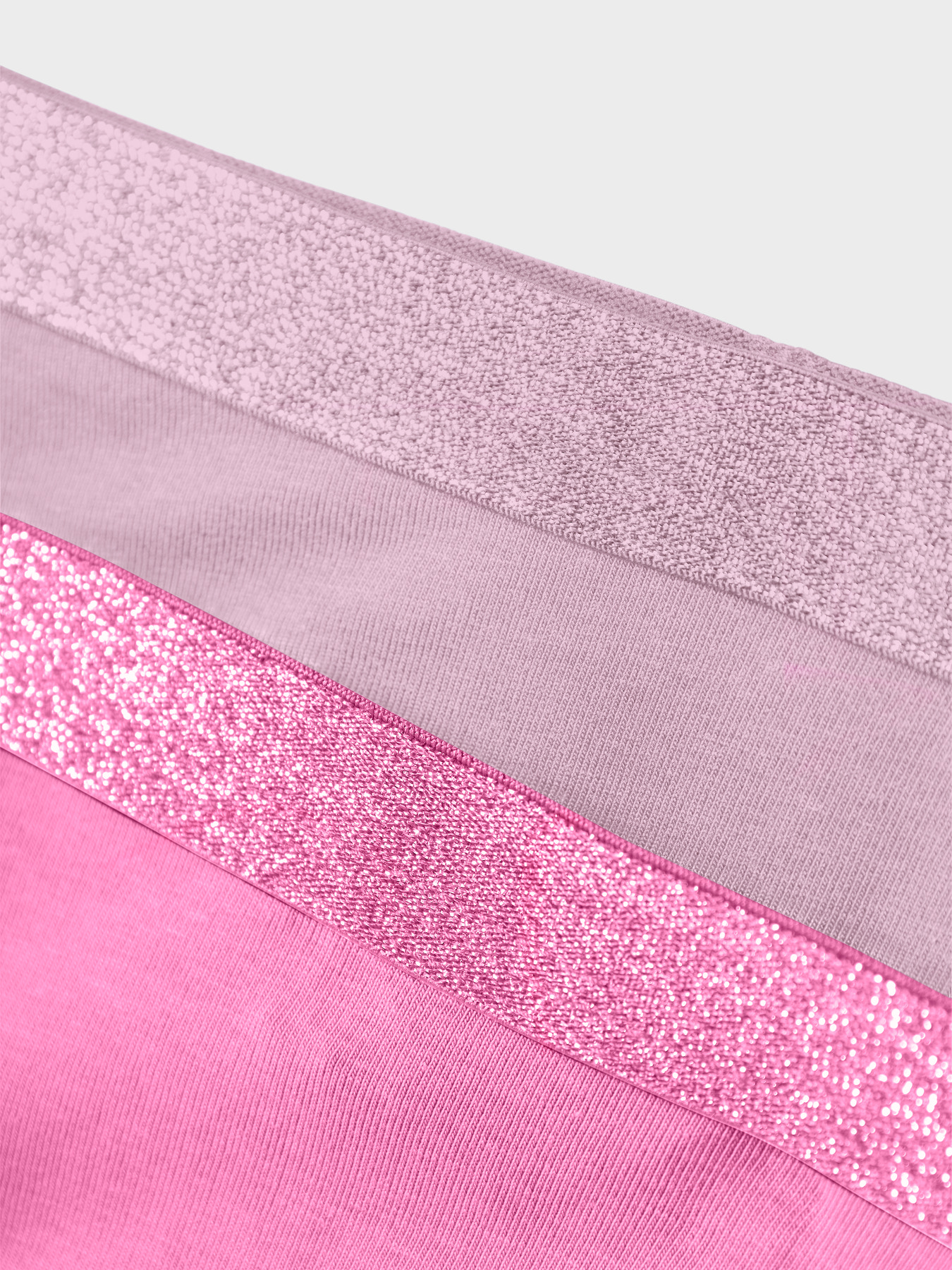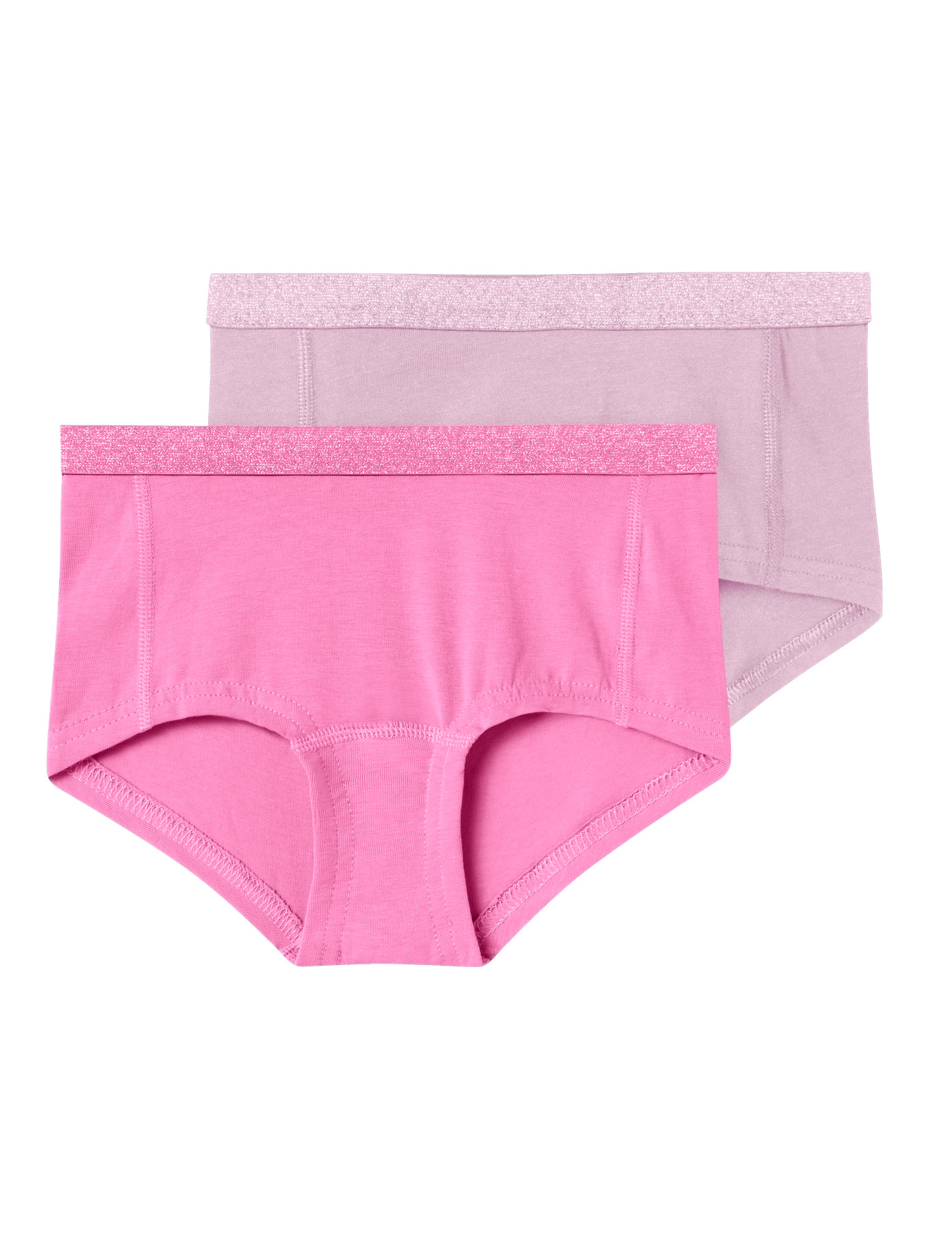 I denne pakke får du 2 par skønne hipsters fra Name It i 2 forskellige farver. Begge har en elastiskkant i livet med lidt glimmer, og er lavet i dejligt blødt bomuld.