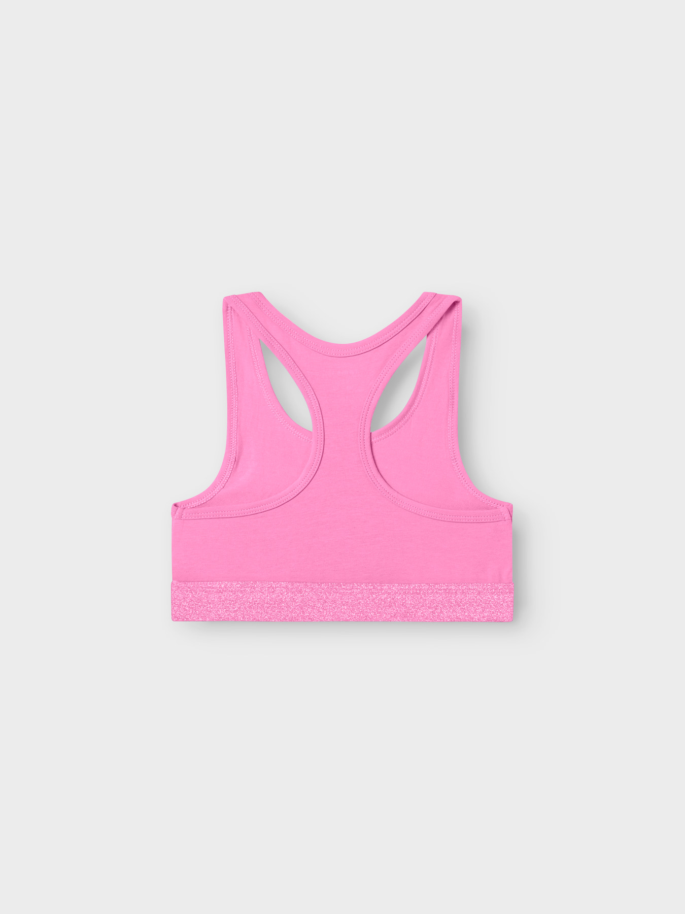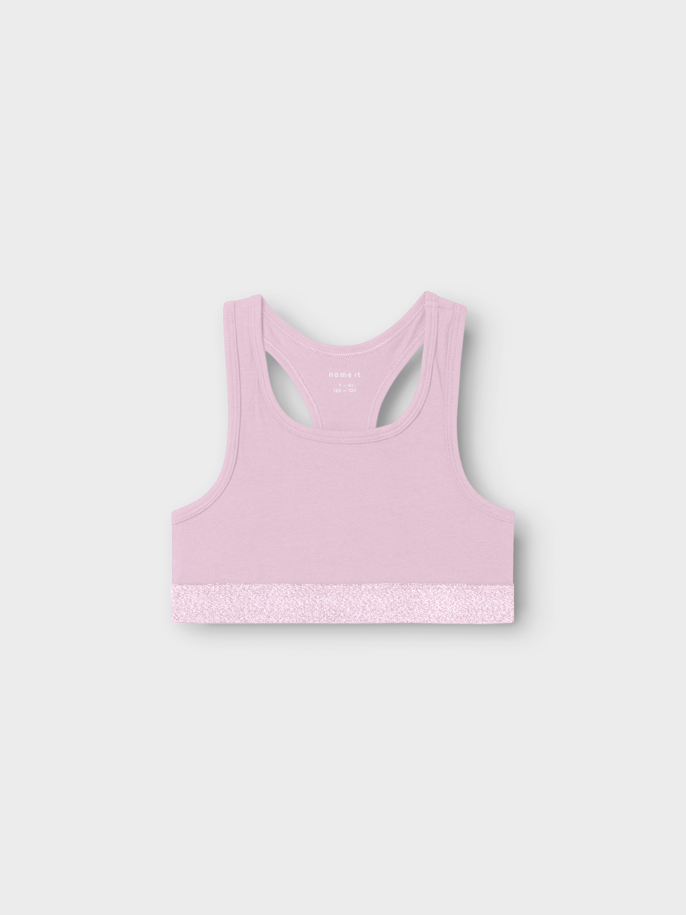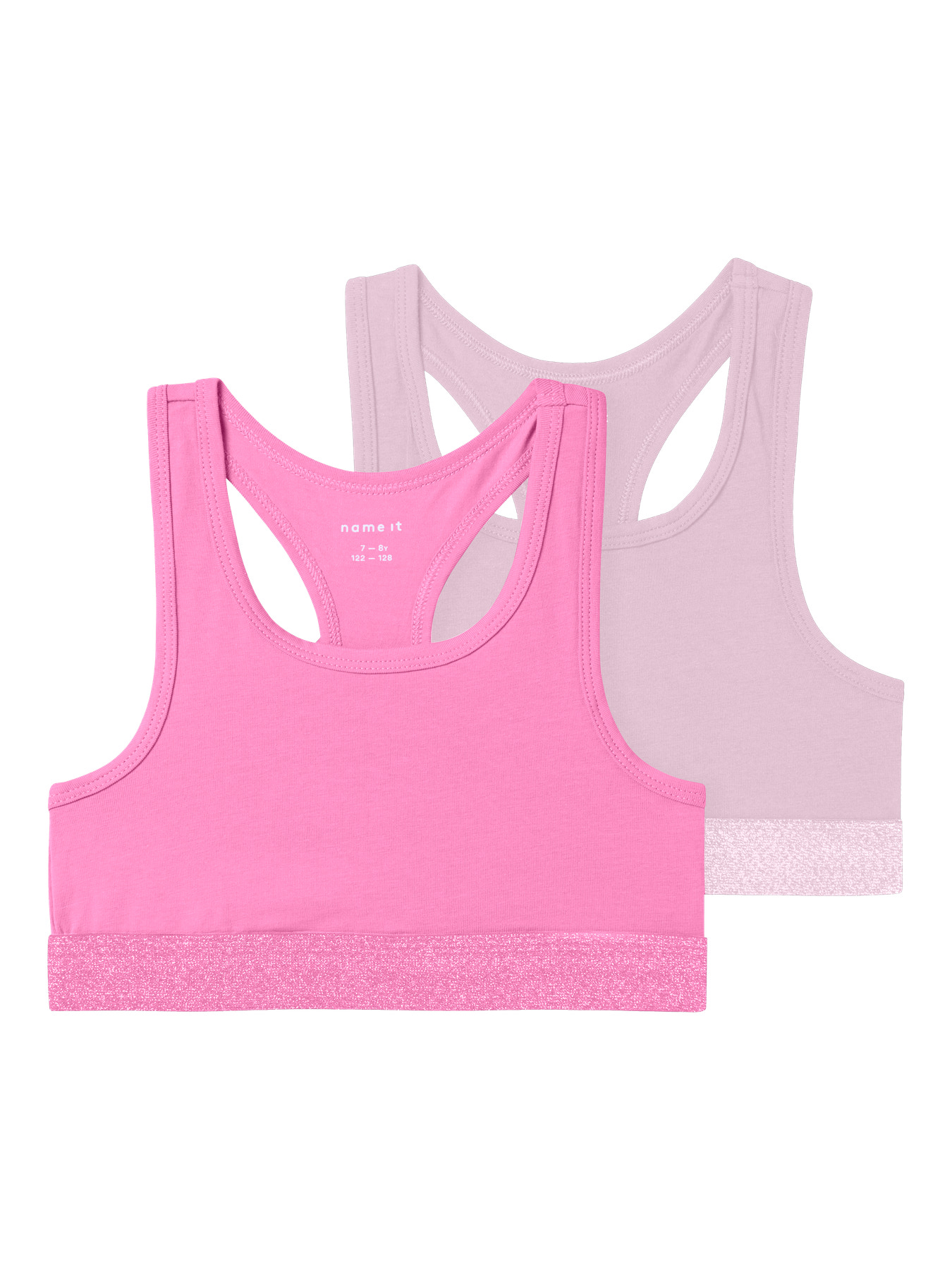 To korte basis tanktoppe fra Name It. Begge har en elastiskkant i livet med lidt glimmer, og er lavet i dejligt blødt bomuld.