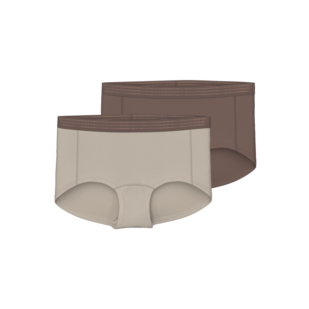 Basis hipsters fra Name It. Begge par har bred elastik kant i livet med guld glimmer tråd. I brune og Beige farver.