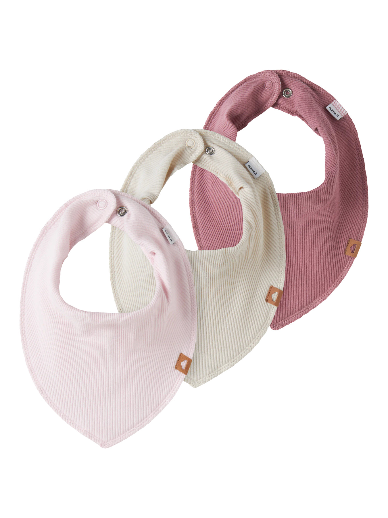 Mega fine rib hagesmækker fra Name it. De kommer i en 3-pak med 3 forskellige fine farver med trykknap lukning i 2 forskellige størrelser.