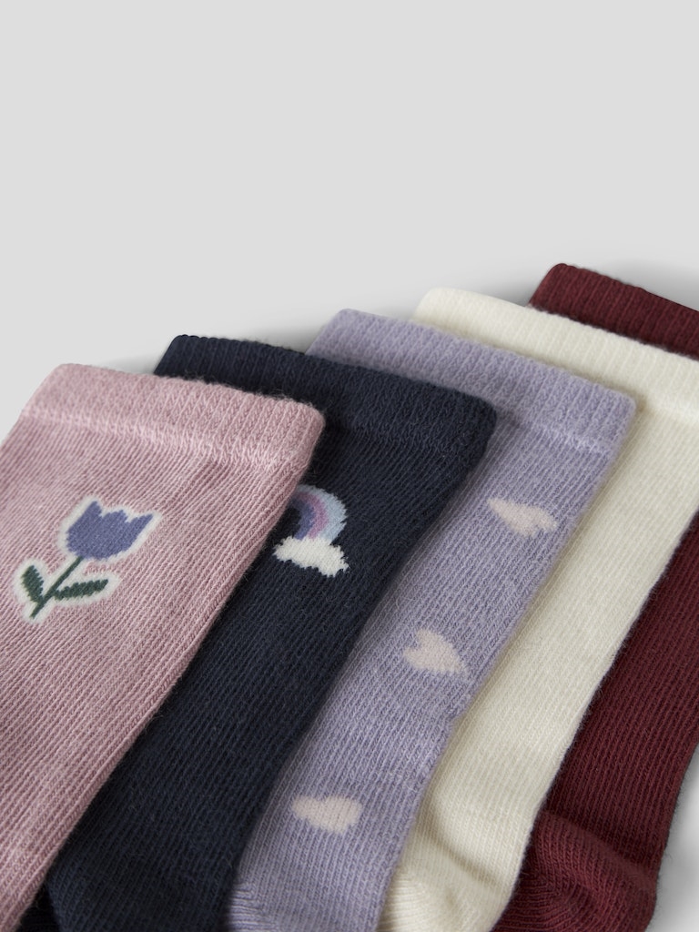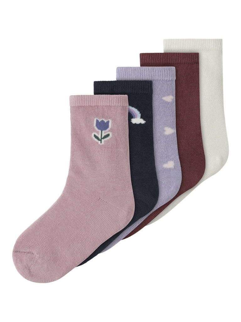 Lækker 5-pak strømper fra name it. Alle strømperne er i forskellige farver og nogle med fine motiver på. Øverst er en god ribkant og strømperne er i et lækkert, strækbart materiale.
