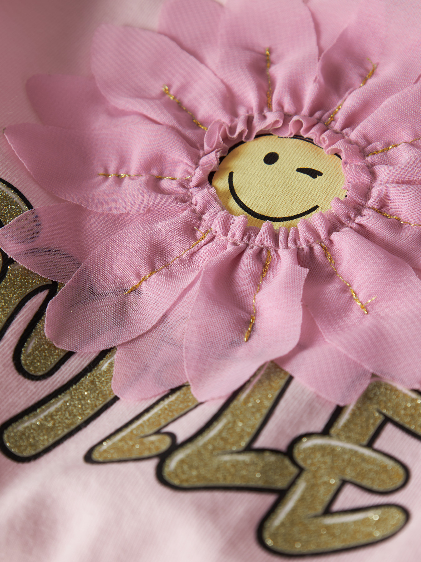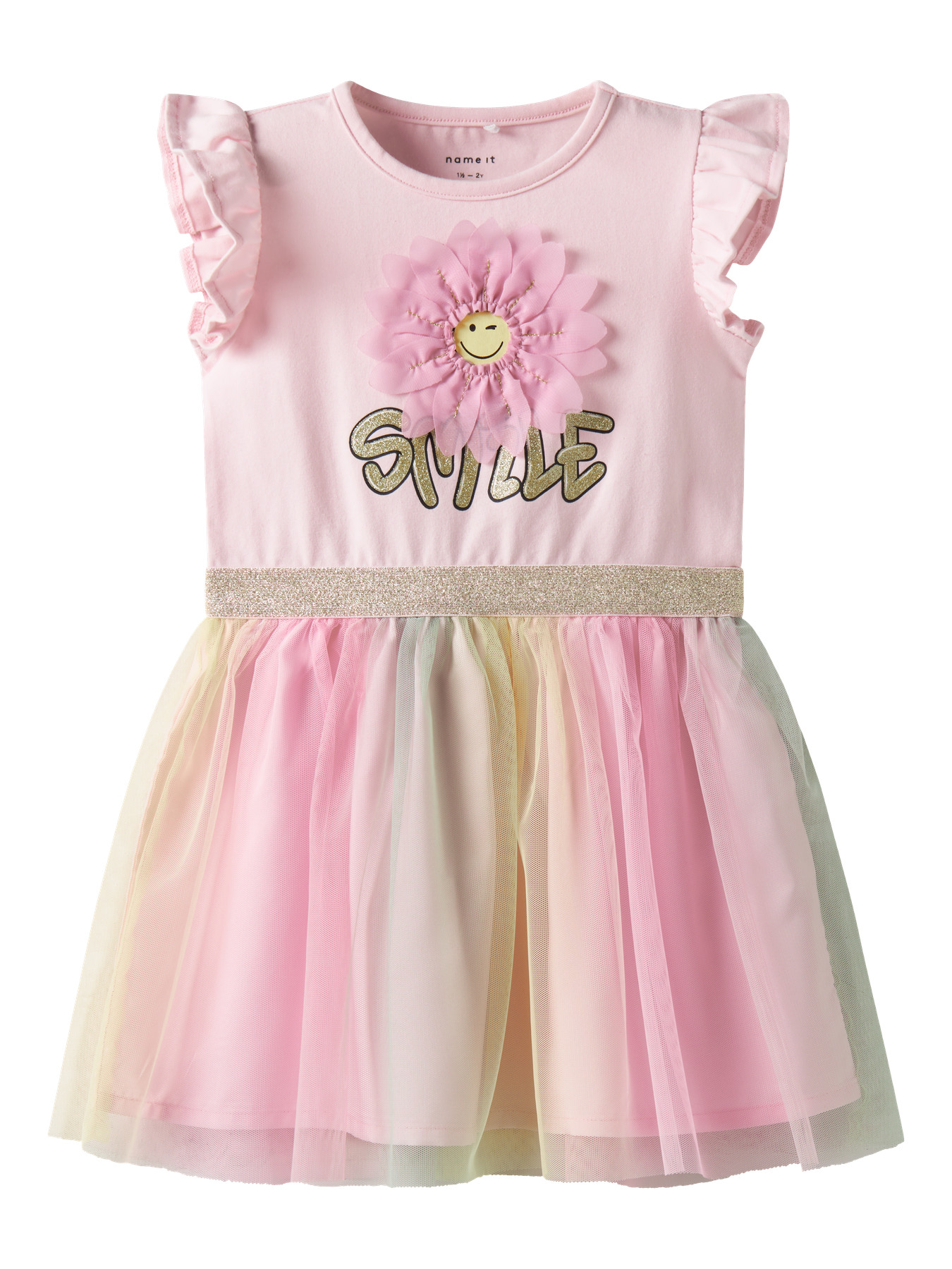 Super sød ballerina kjole fra Name It med en skøn blomst på maven, glimmer detaljer og flæser ved ærmerne.