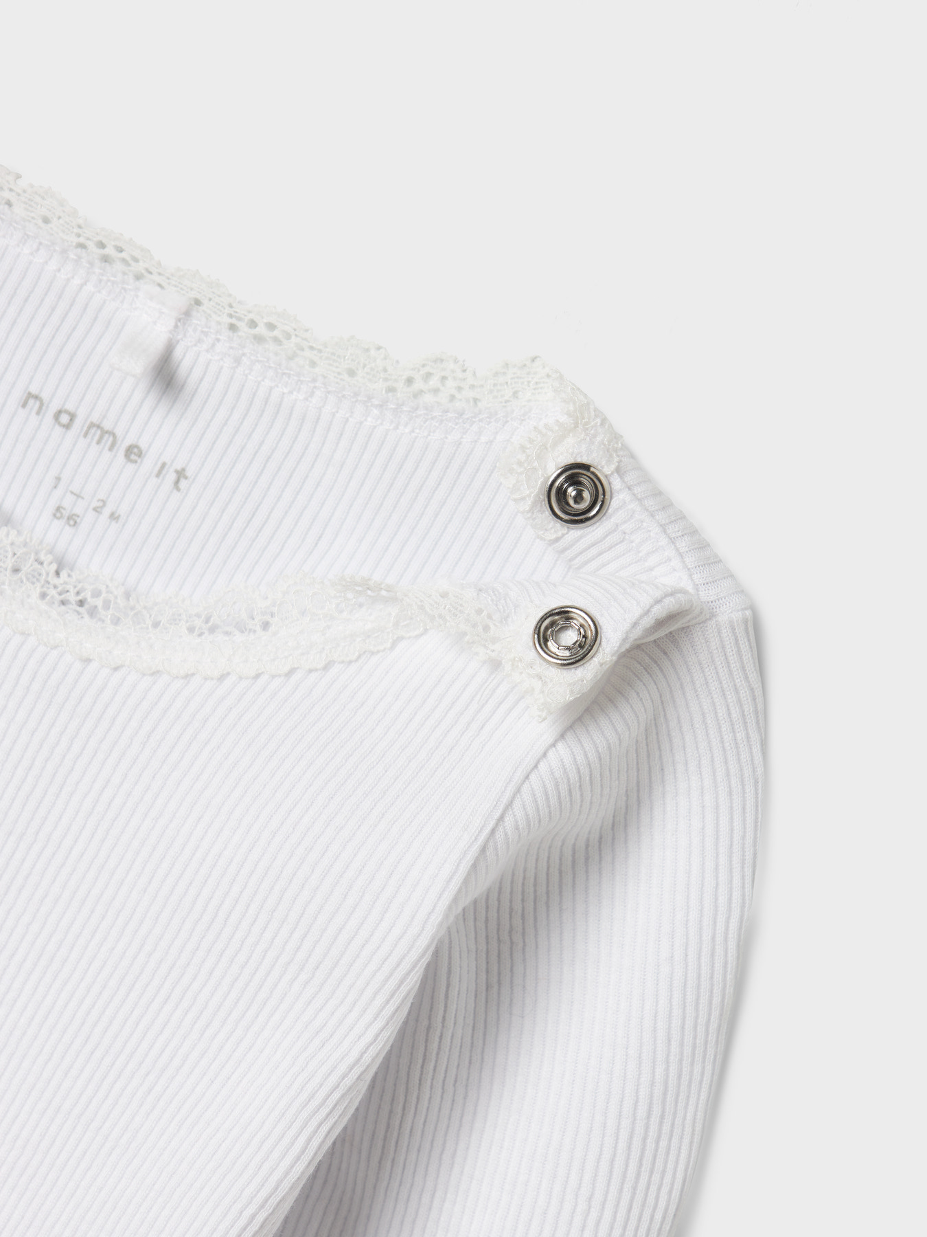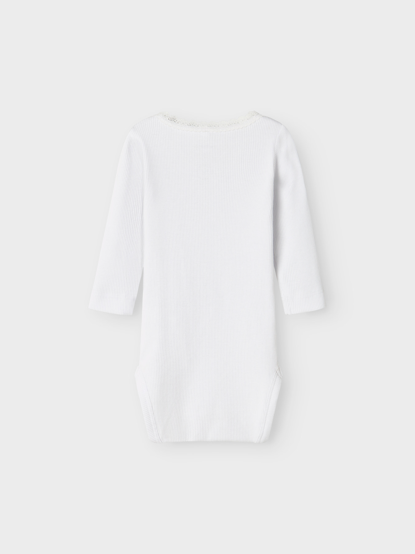 Super sød hvid rib body fra Name It lavet i det skønne bløde modal stof. Bodyen har lange ærmer, blondekrave ved halsen og trykknapper ved venstre skulder og imellem benene.