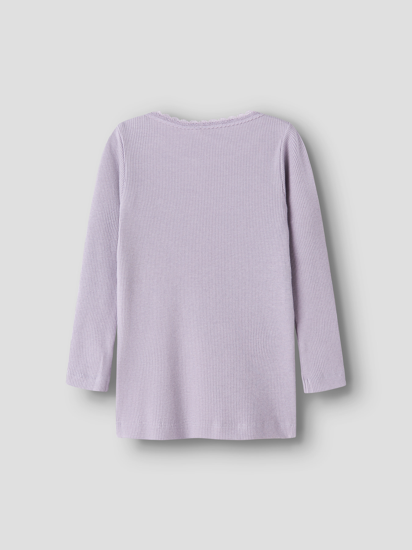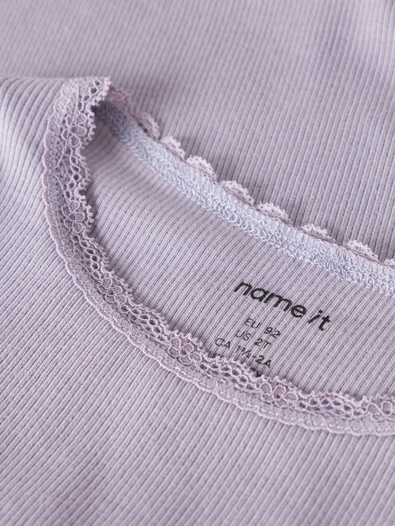 Super sød rib bluse fra Name It lavet i det skønne bløde modal stof. Blondekrave ved halsen og lange ærmer.