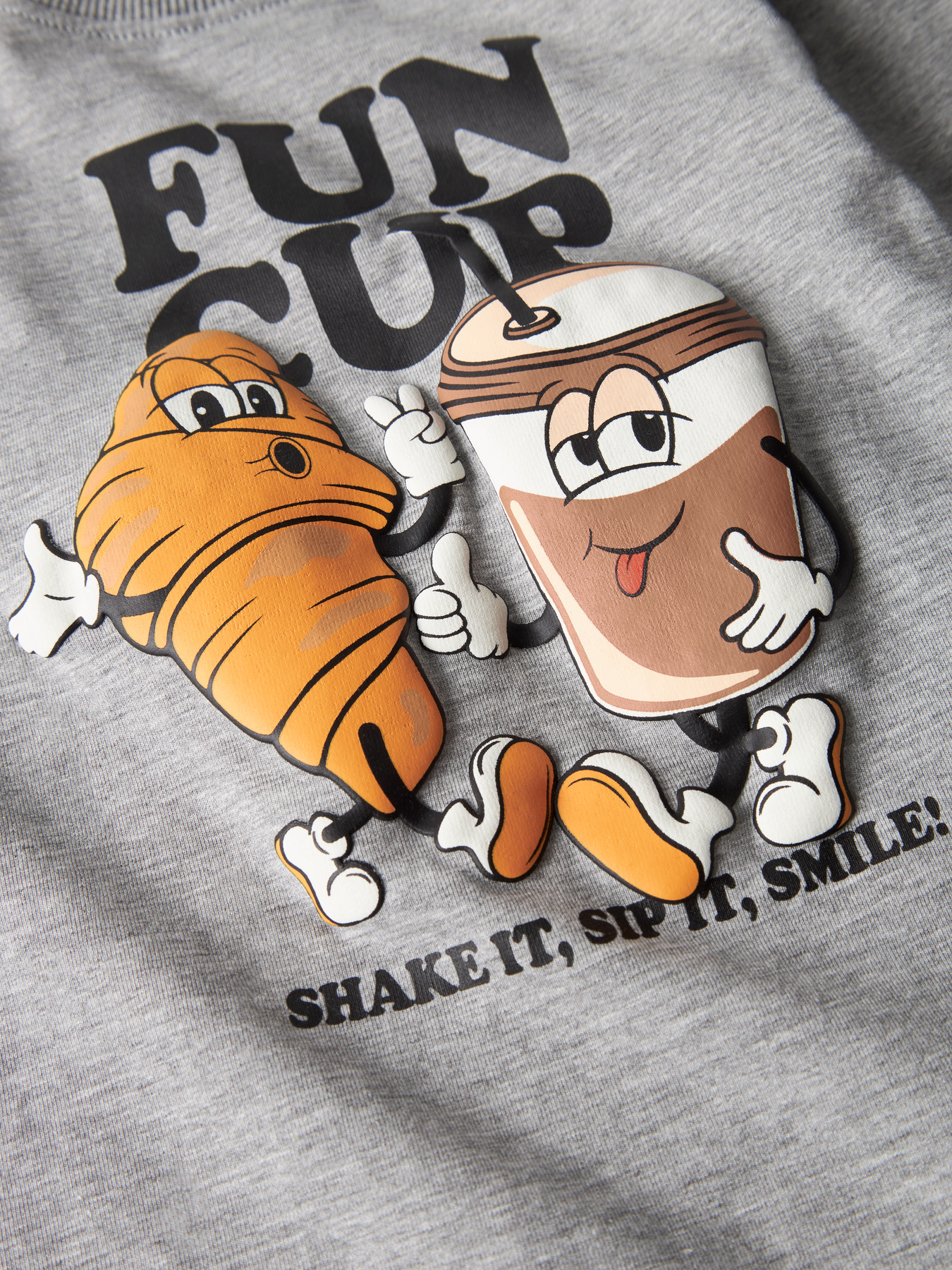 Mega sej bluse fra name it. Blusen er grå med et sejt print på maven. Den har rund hals, og er i et regular fit.