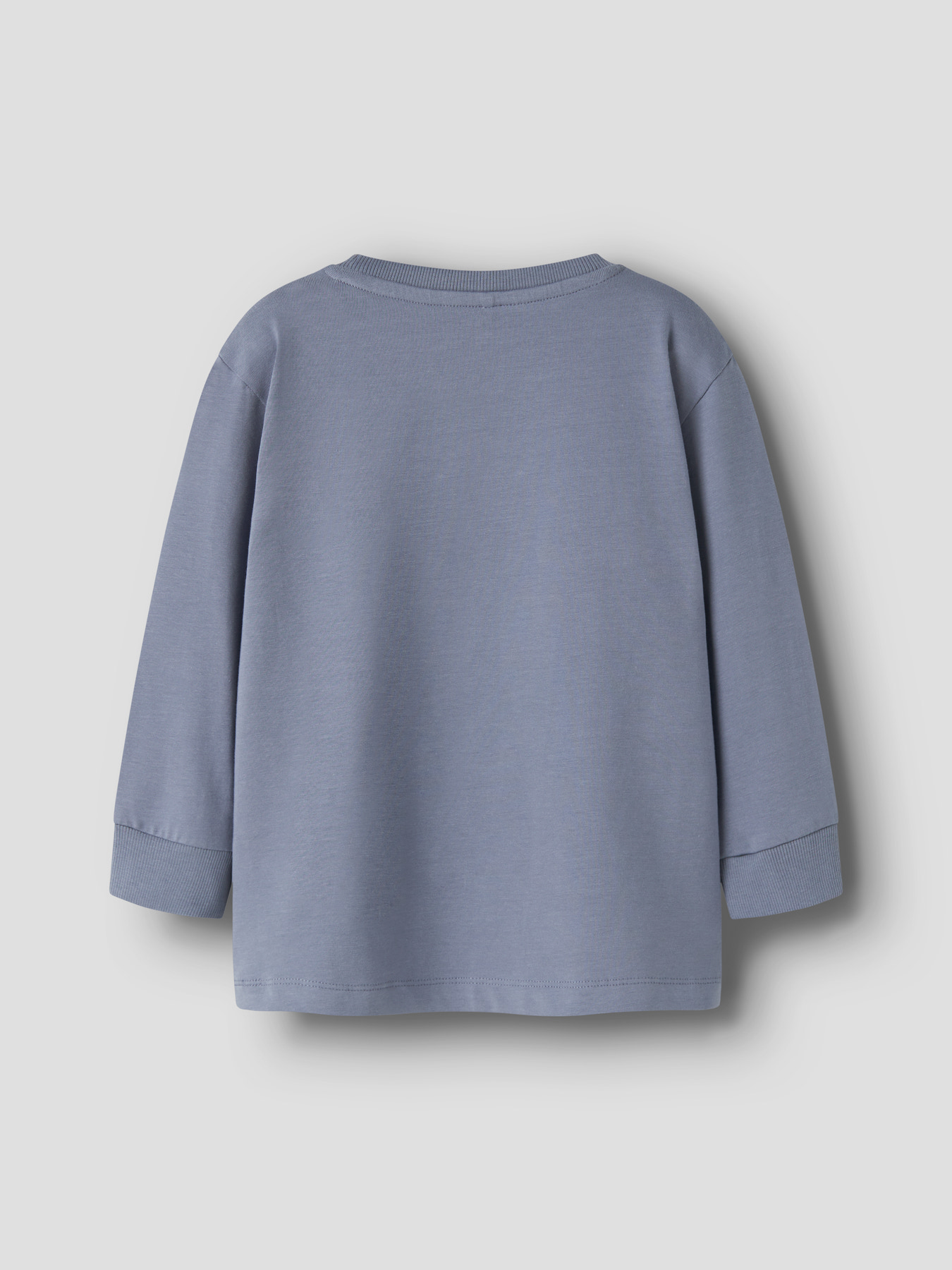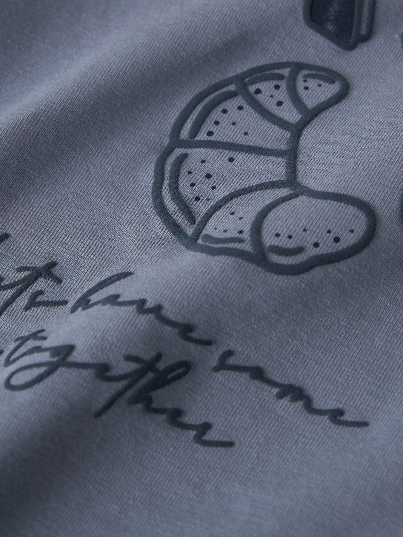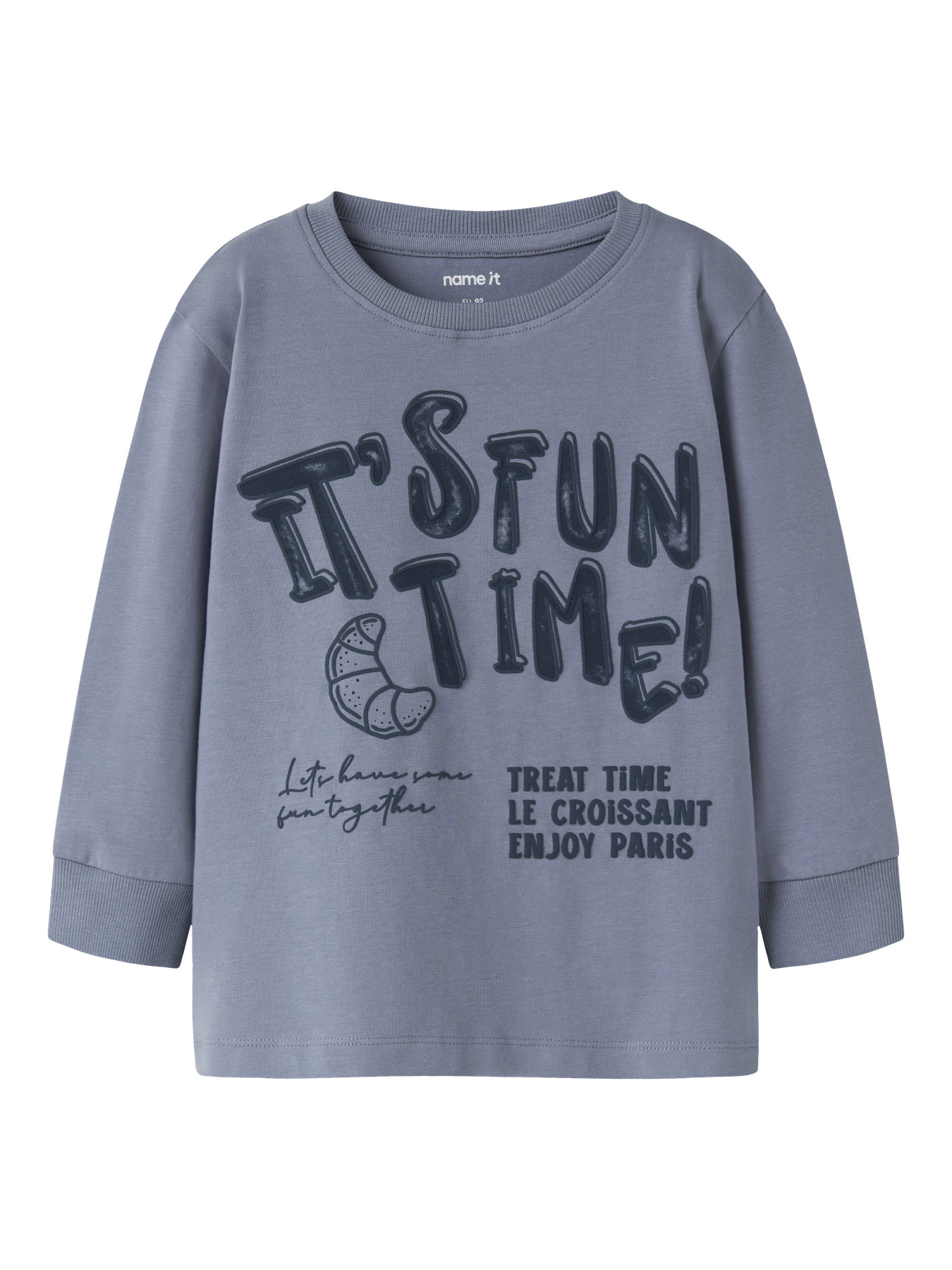 Mega fin langærmet bluse fra Name it. Den er i lækker blå farve med tekst og croissant print på maven. Den er med elastikkanter ved hænderne og langs maven.