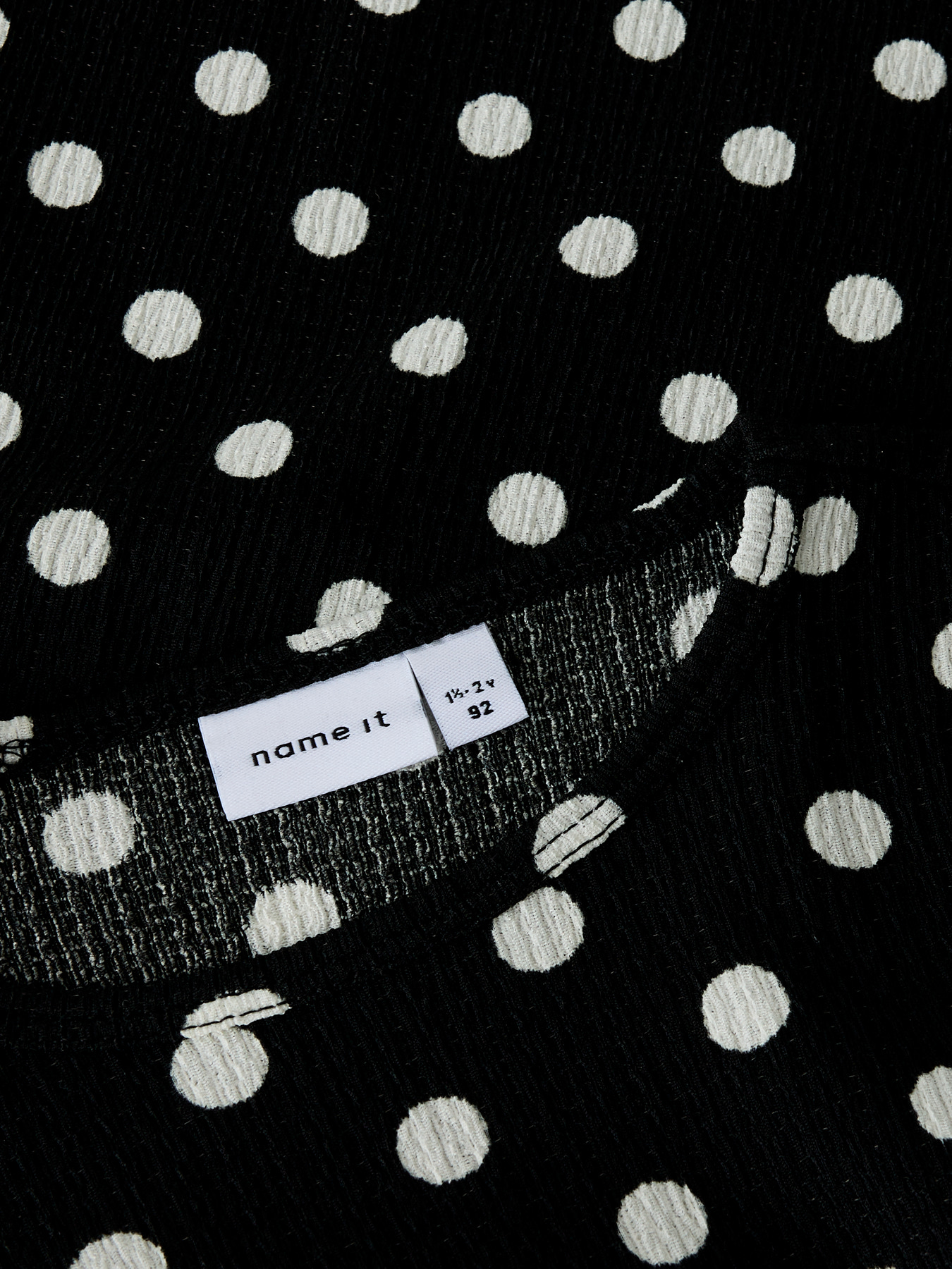 Mega fin bluse fra name it. Den er sort med hvide prikker, den har en fin detalje med bølgekant forneden.