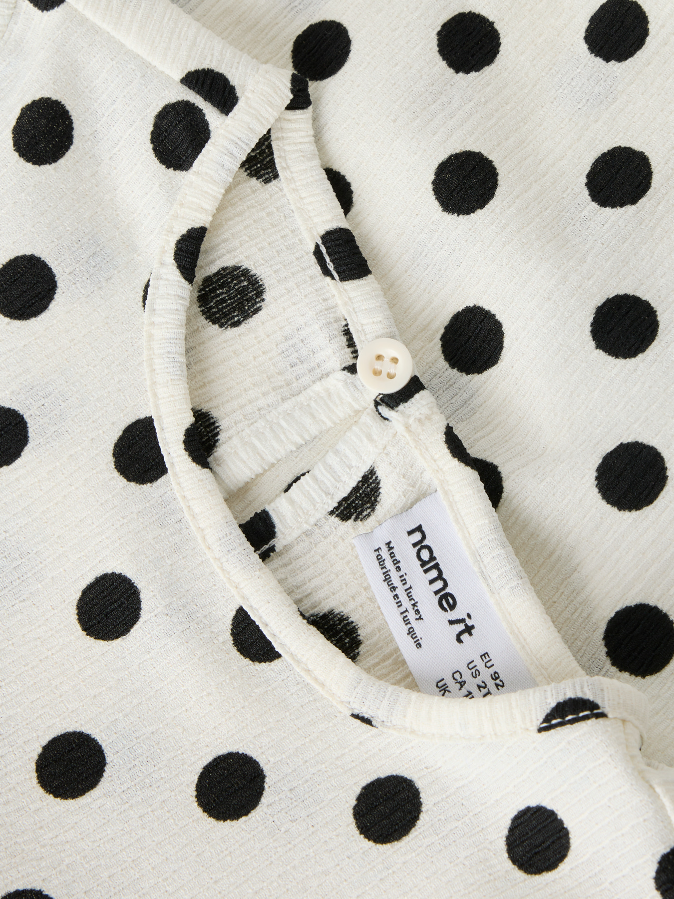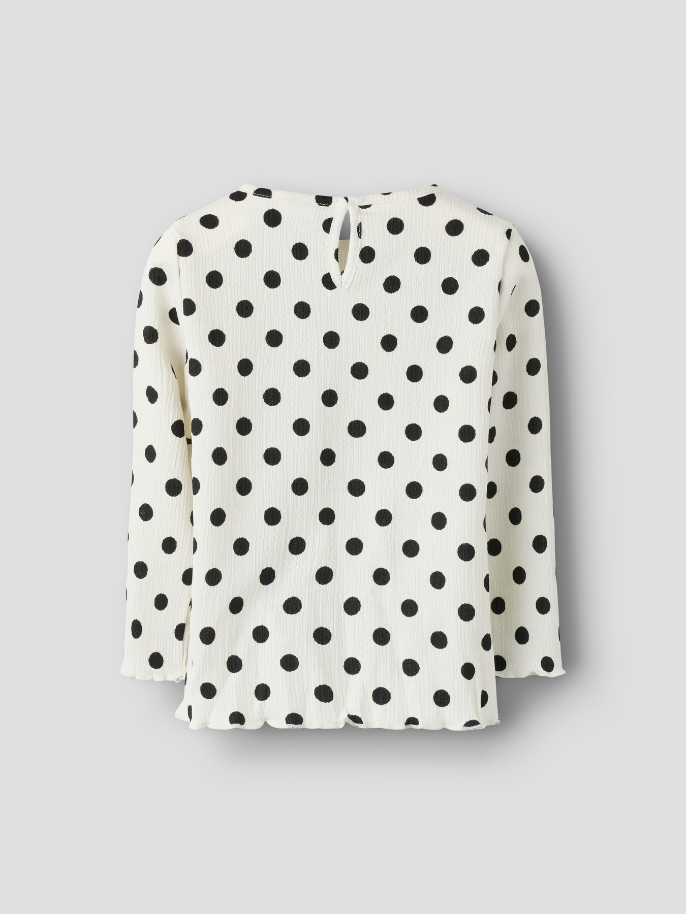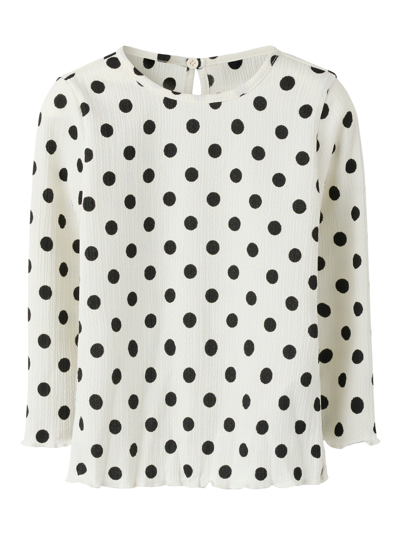 Mega fin bluse fra name it. Den er lys med sorte prikker, den har en fin detalje med bølgekant forneden.