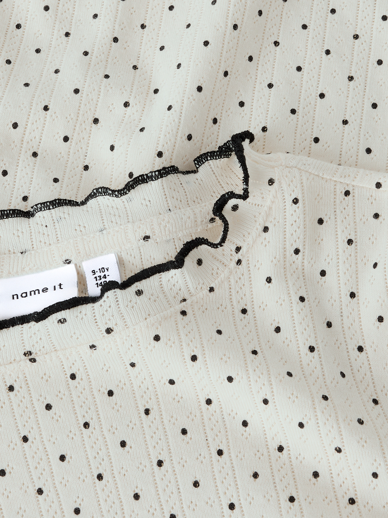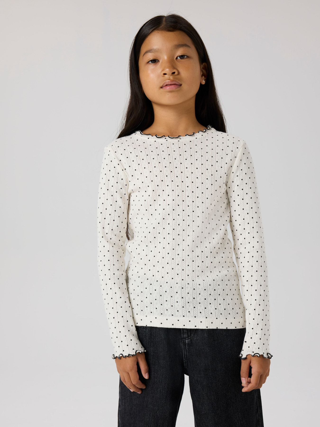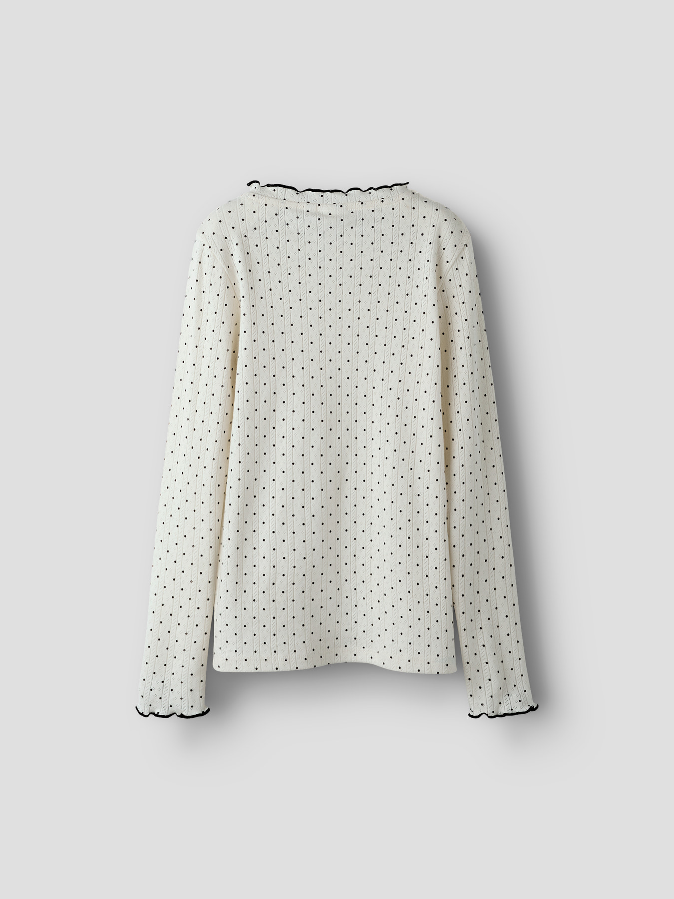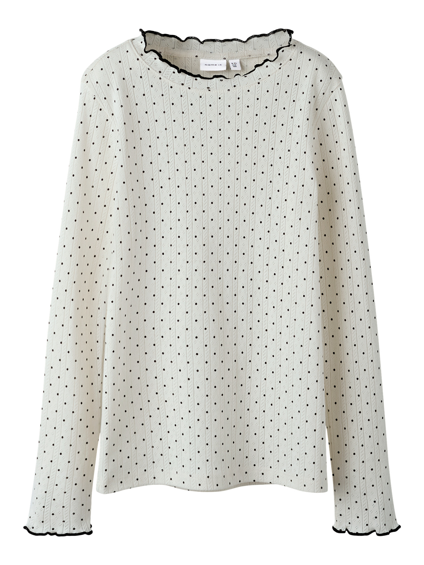 Den sødeste bluse fra name it. Den er i en skøn farve med prikker på og en lille flæsekant.