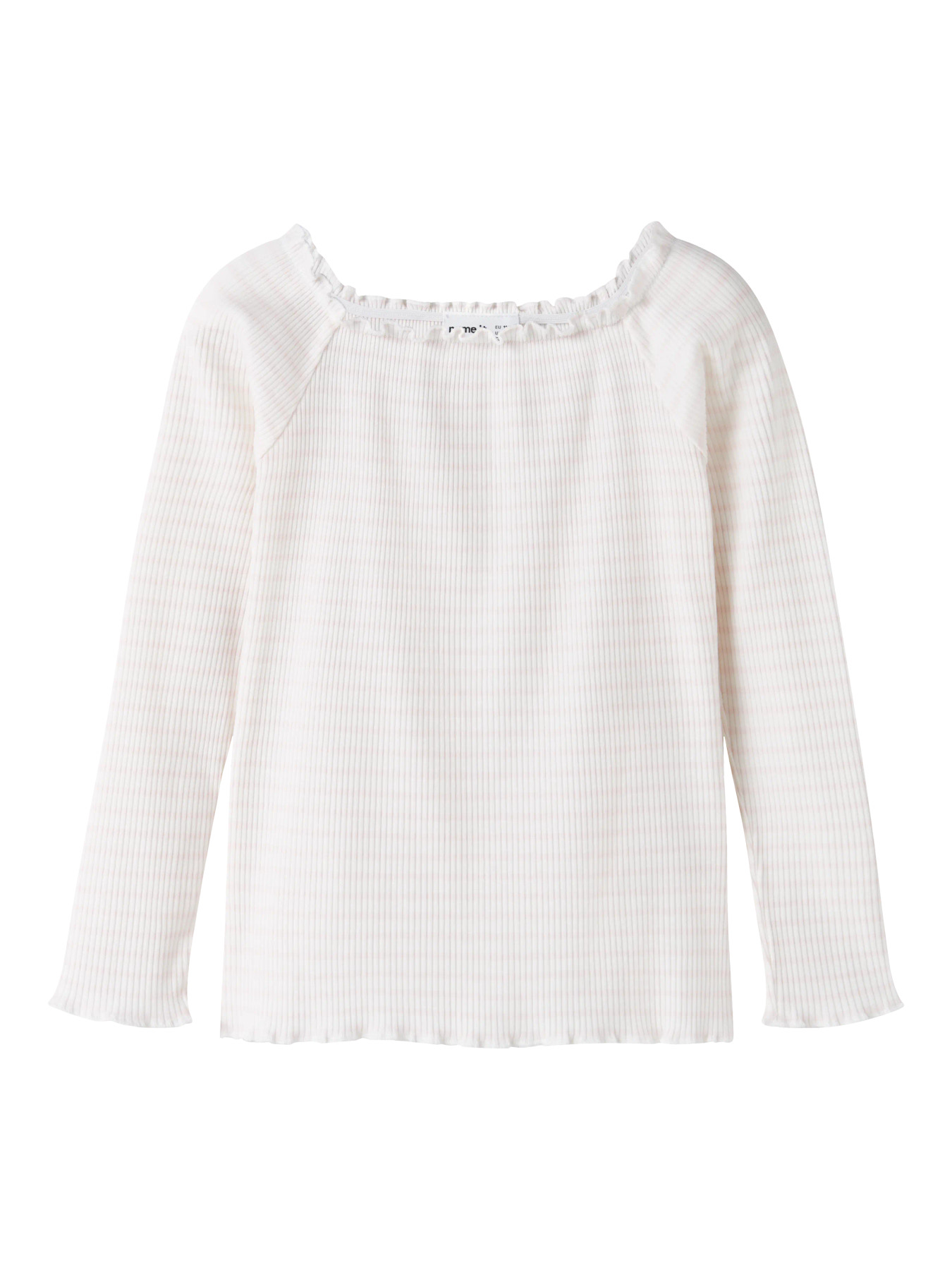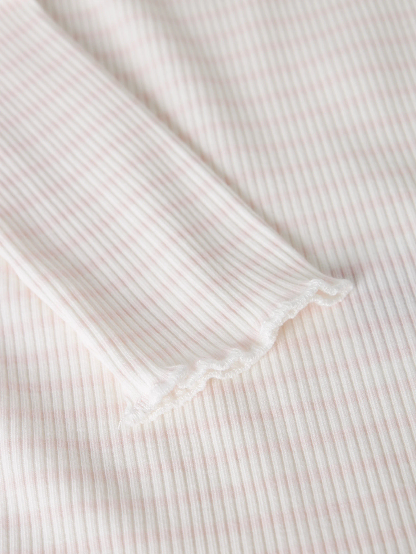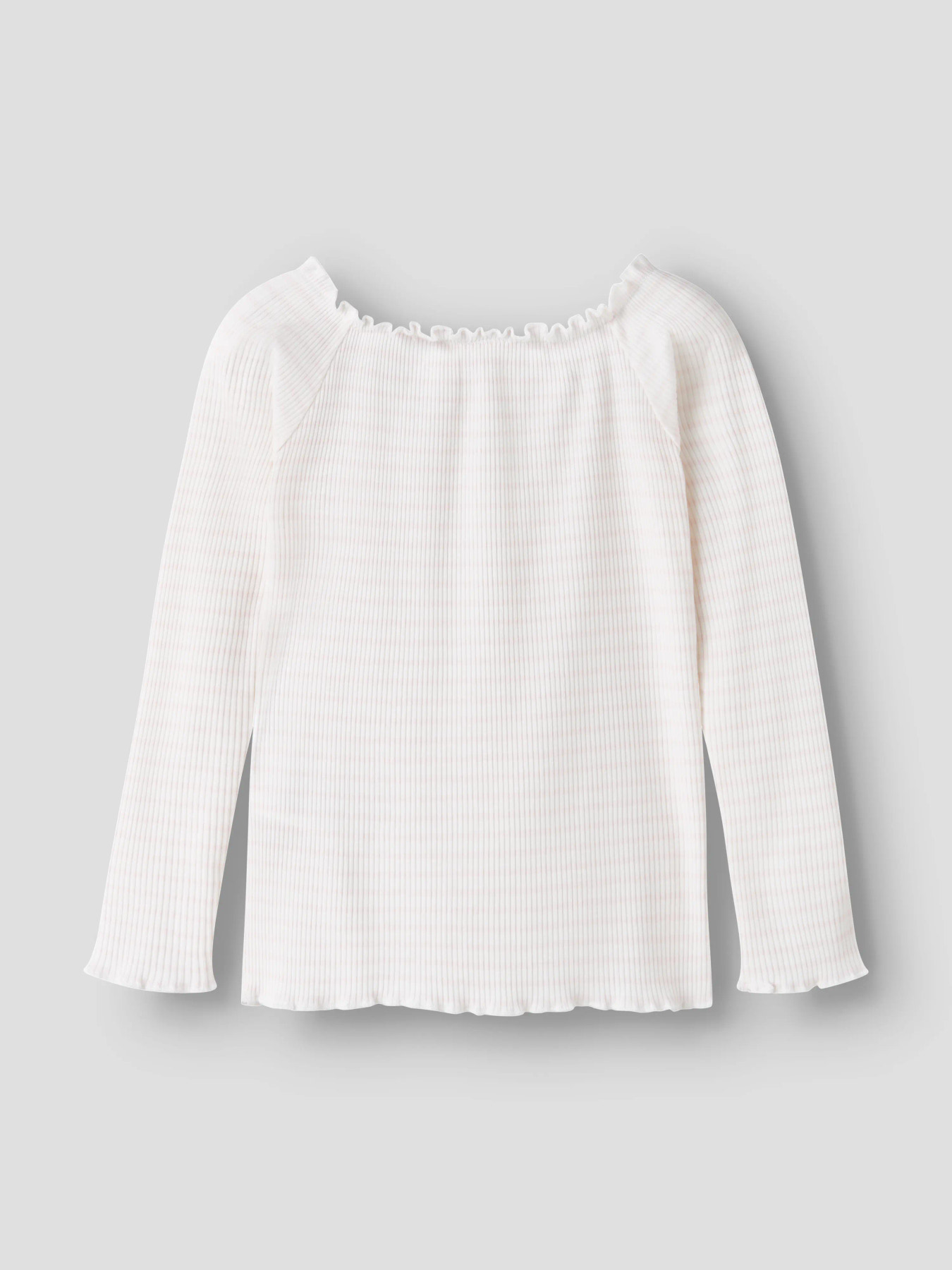 Blød og elastisk top i ribstrik med lodrette striber og babylock-detalje. Toppen har bådhals, lange ærmer og slim fit, der giver en behagelig pasform og et tidløst, stilfuldt look til hverdag og leg.