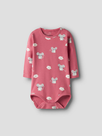 Mega sød langærmet body fra Name it med skønt print af små mus i fine farver. Bodyen lukkes med trykknapper.