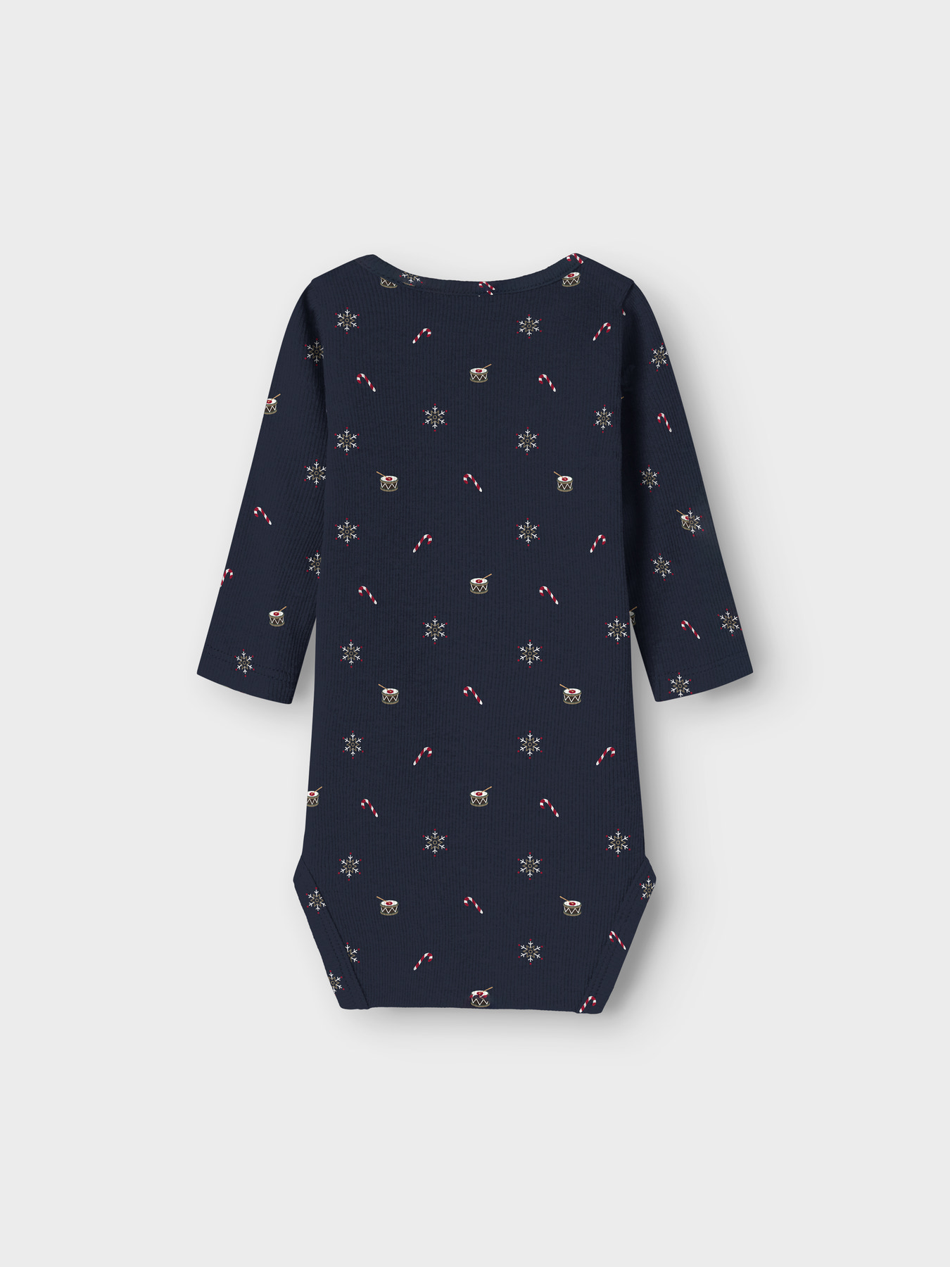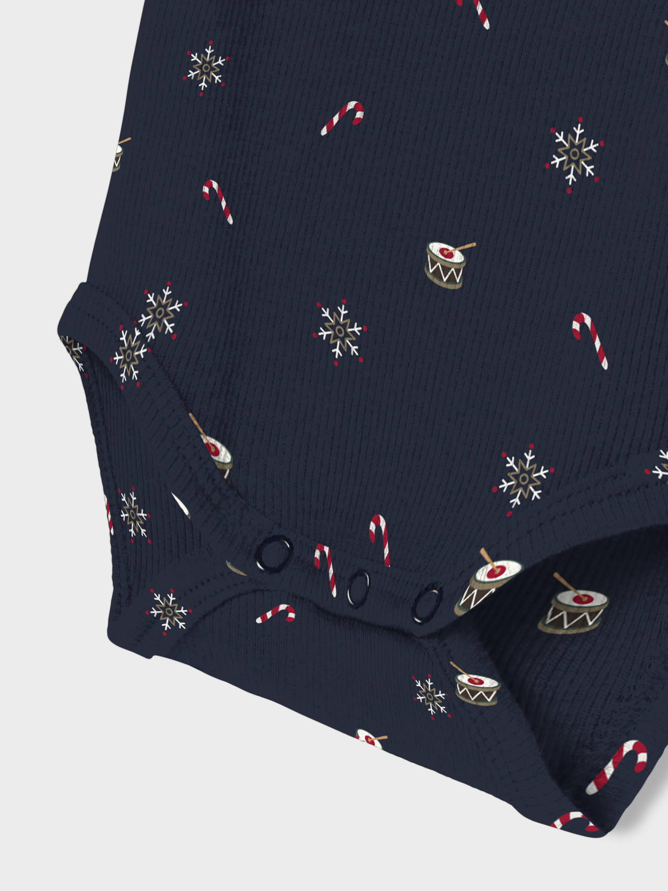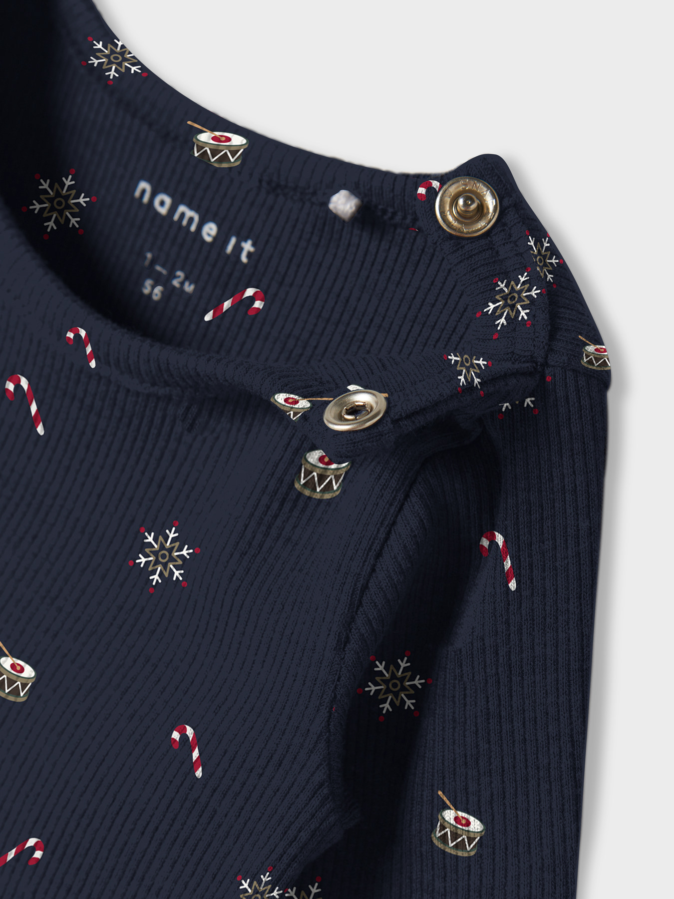 Den sødeste body fra name it. Den har rund hals, blå med julemotiver på og lavet i det lækreste modal blandings materiale.