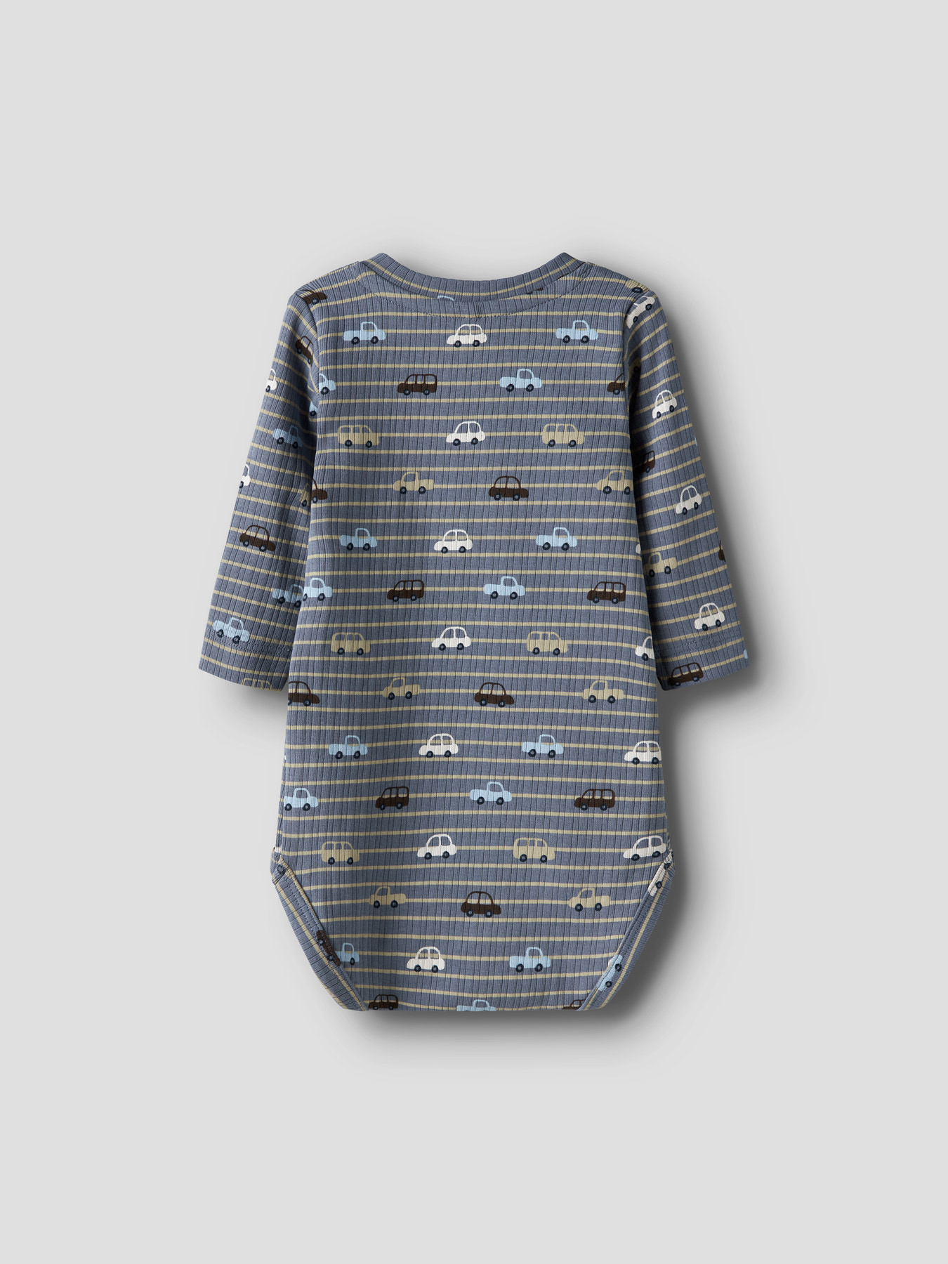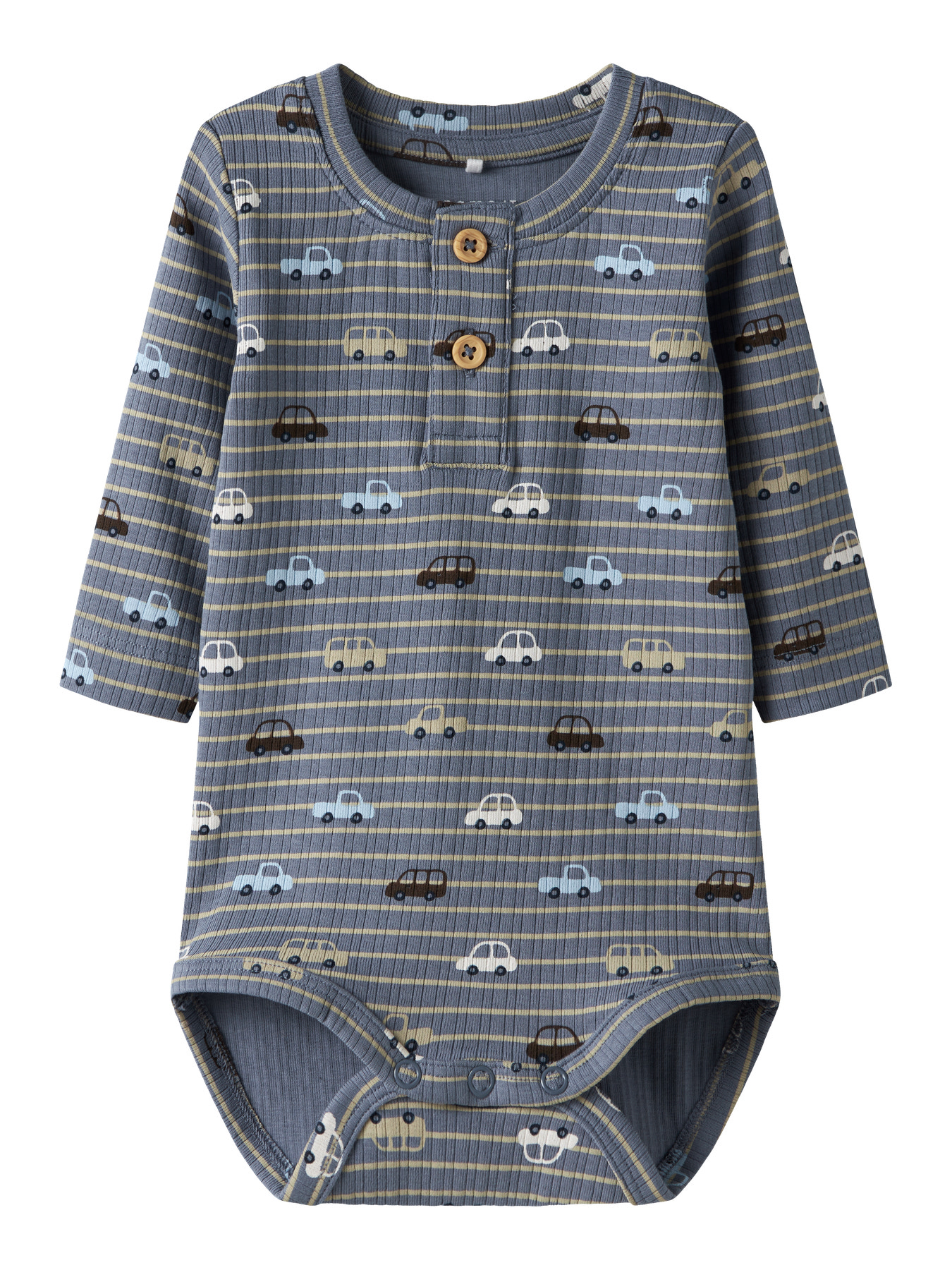Mega sød body fra name it. Bodyen er i en skøn blå farve med biler på, den har knapper foran, og trykkerknapper forneden.