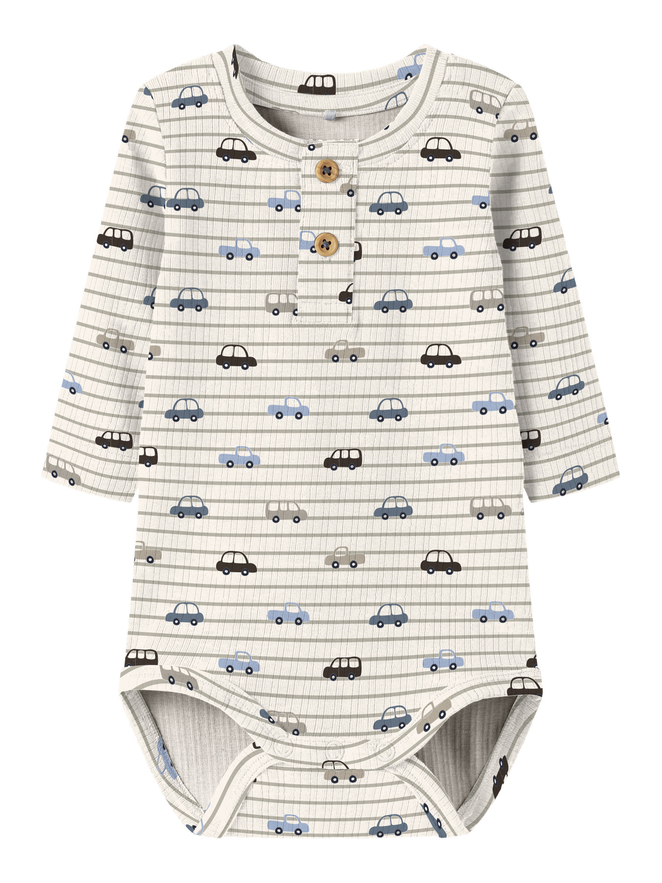 Mega sød body fra name it. Bodyen er i en skøn farve med biler på, den har knapper foran, og trykkerknapper forneden.