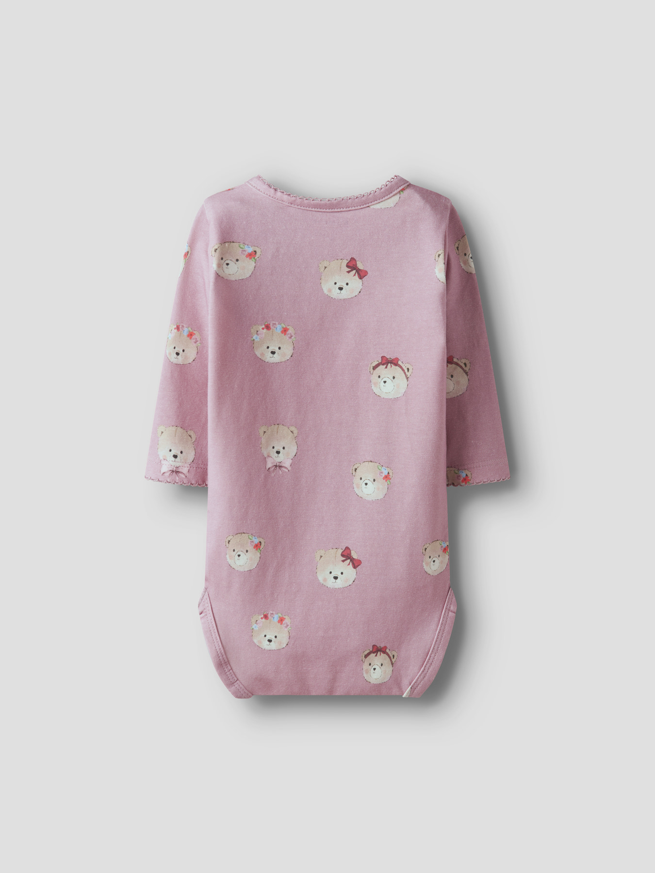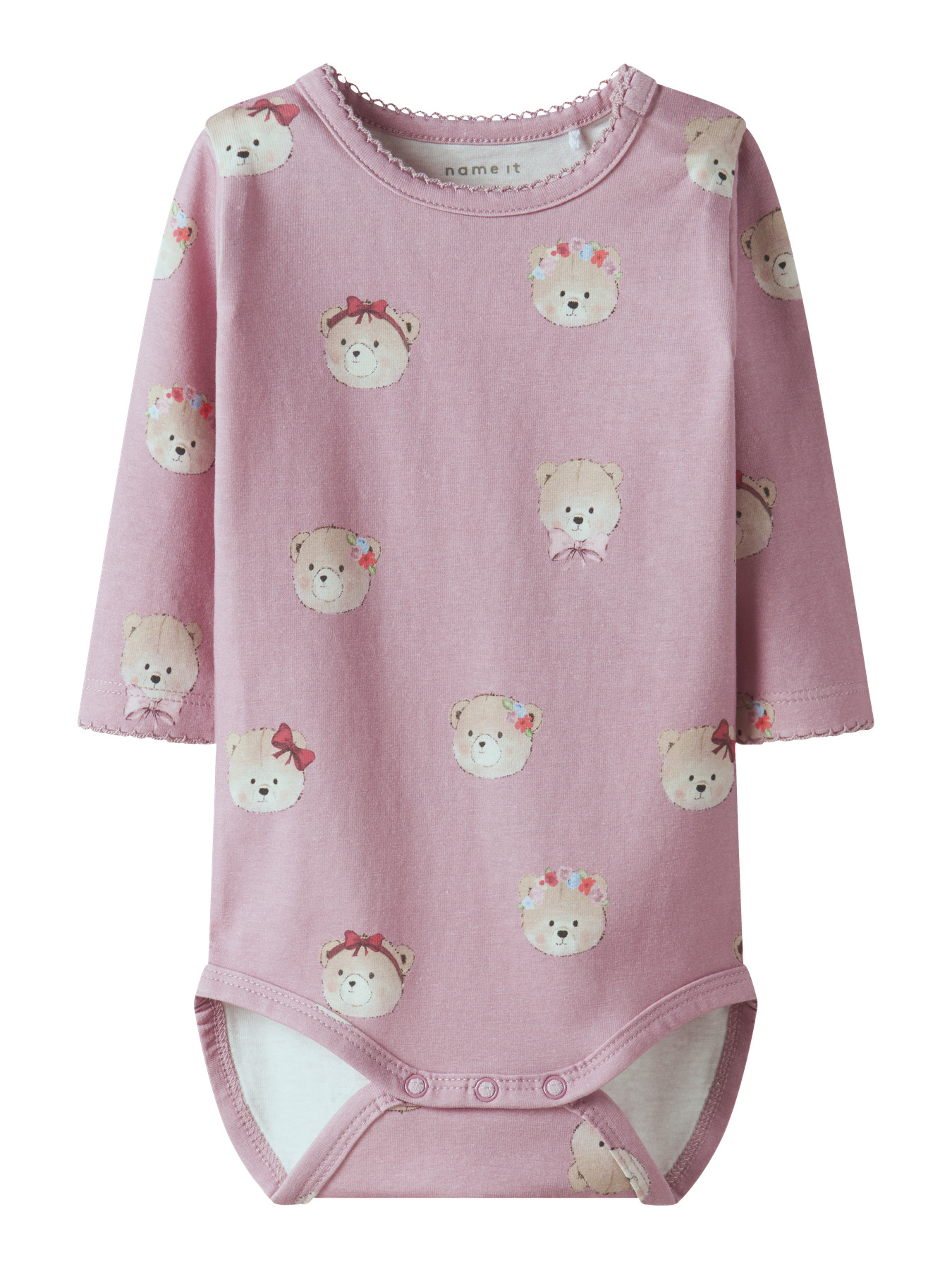 Mega sød body fra name it. Den er i en skøn farve med små bamse hoveder på. Bodyen har trykknapper.